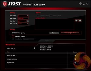 RAMDisk could well be a useful utility on a platform like X299 where up to 128GB of RAM is supportable making RAM Disks of genuinely useful capacities possible. We didn't have the opportunity to extensively test it but it was easy enough to set up a 4GB RAM Disk and use it to cache an instance of Google Chrome. Given the already fast SSD being used for the operating system drive it was hard to discern a significant performance difference but your mileage may vary.