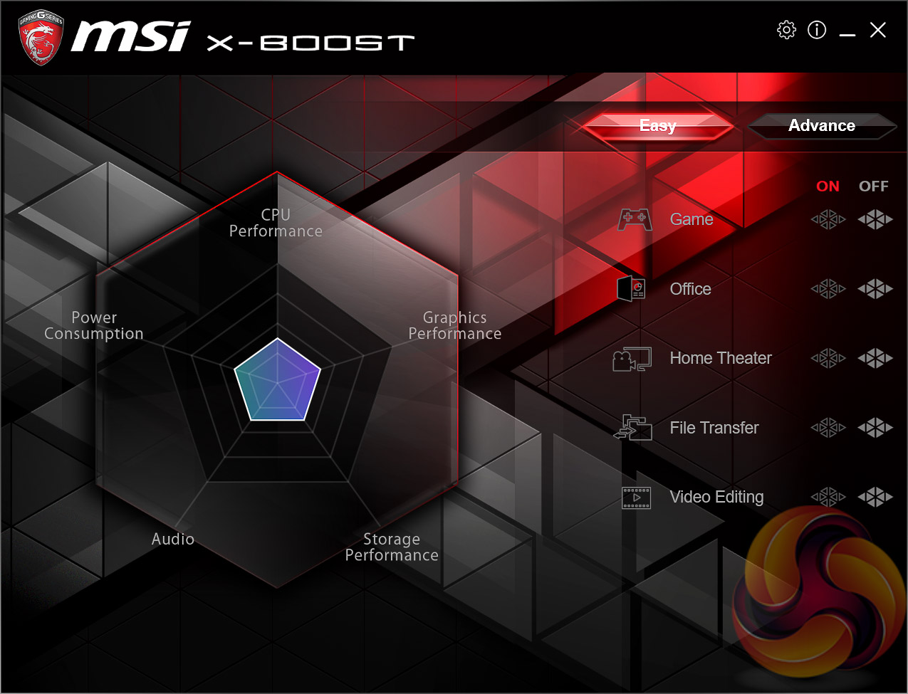 X-Boost seems to be a new MSI utility which functions similarly to something like the ASUS EPU/TPU power & performance profiles. MSI offers five different profile presets (Game, Office, Home Theater, File Transfer, Video Editing) which adjust the priority given to one of five key areas (CPU Performance, Graphics Performance, Storage Performance, Audio or Power Consumption