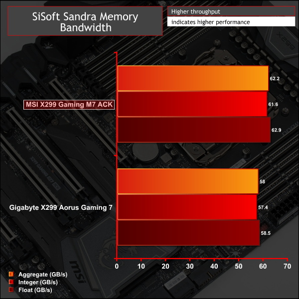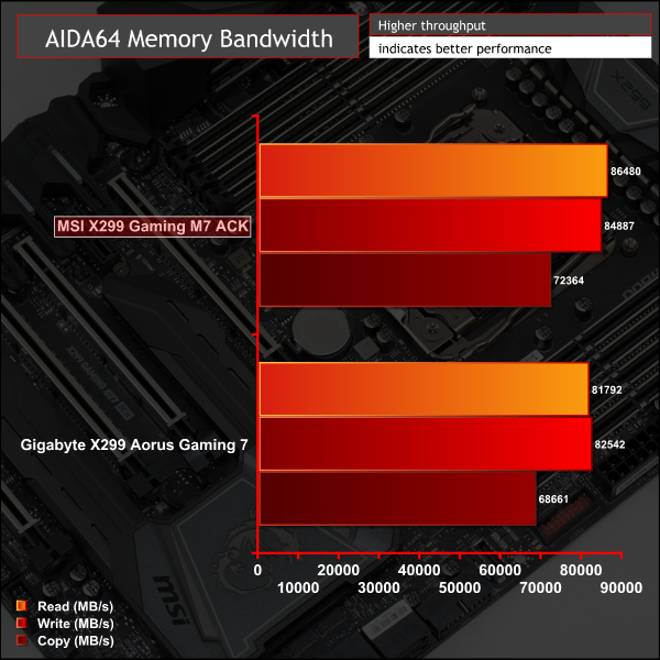 Memory performance is strong and initial problems with quad channel memory performance on X299 seem to be fading away. Some compatibility issues were experienced during our testing including a number of instances of the board going into dual or triple channel mode and losing significant throughput but we identified this issue as an intermittent fault in the memory kit and after testing a different memory kit performance was right back on the money.