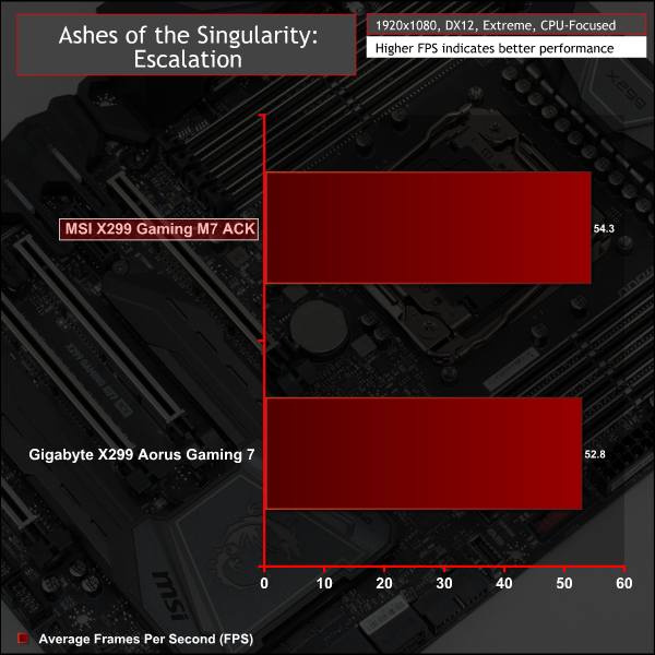 Ashes of the Singularity: Escalation is a Sci-Fi real-time strategy game built for the PC platform. The game includes a built-in benchmark tool and was one of the first available DirectX 12 benchmarks. We run the CPU-focused benchmark using DirectX 12, a 1080p resolution and the Extreme quality preset.