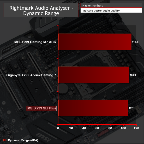 Audio performance scored one “Good” and seven “Excellent” ratings. The numbers produced were typical of a Realtek ALC1220-based audio solution which means there is high quality audio across the board and the inclusion of an operational amplifier will please headphone users.
