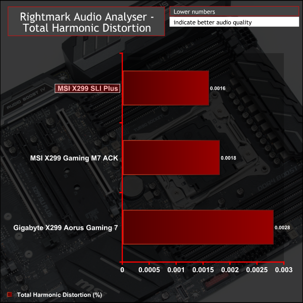 Rightmark Audio Analyser is a freeware benchmarking utility designed to objectively test the performance characteristics of audio solutions. We setup a line-in line-out loop and execute the record/playback test before generating the results report you see below. A sampling mode of 24-bit, 192 kHz is tested where available. If unavailable the closest alternative operating mode available is used and clearly marked.