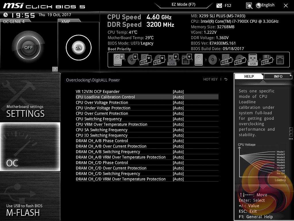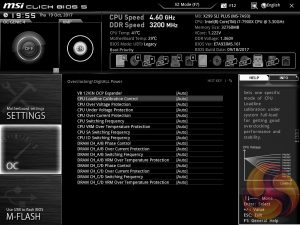 The range of LLC options is extensive too with Mode 1 (most aggressive) to Mode 8 (least aggressive) as well as an option for No overvolting, which is even less aggressive on the voltage than Mode 8. From our testing mode 2 will ensure an almost perfect voltage stability under load, mirroring the voltage specified in BIOS, while mode 3 isn’t far off either. The visual diagram MSI provides within the BIOS is useful in ascertaining the behaviour of each CPU LLC mode.