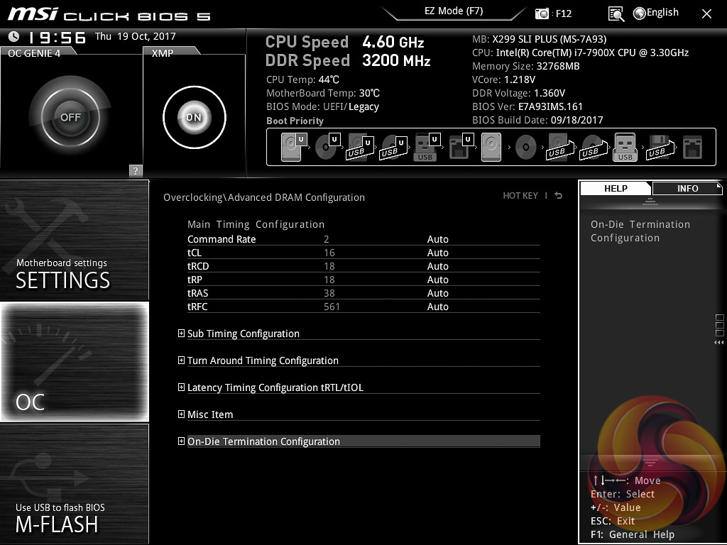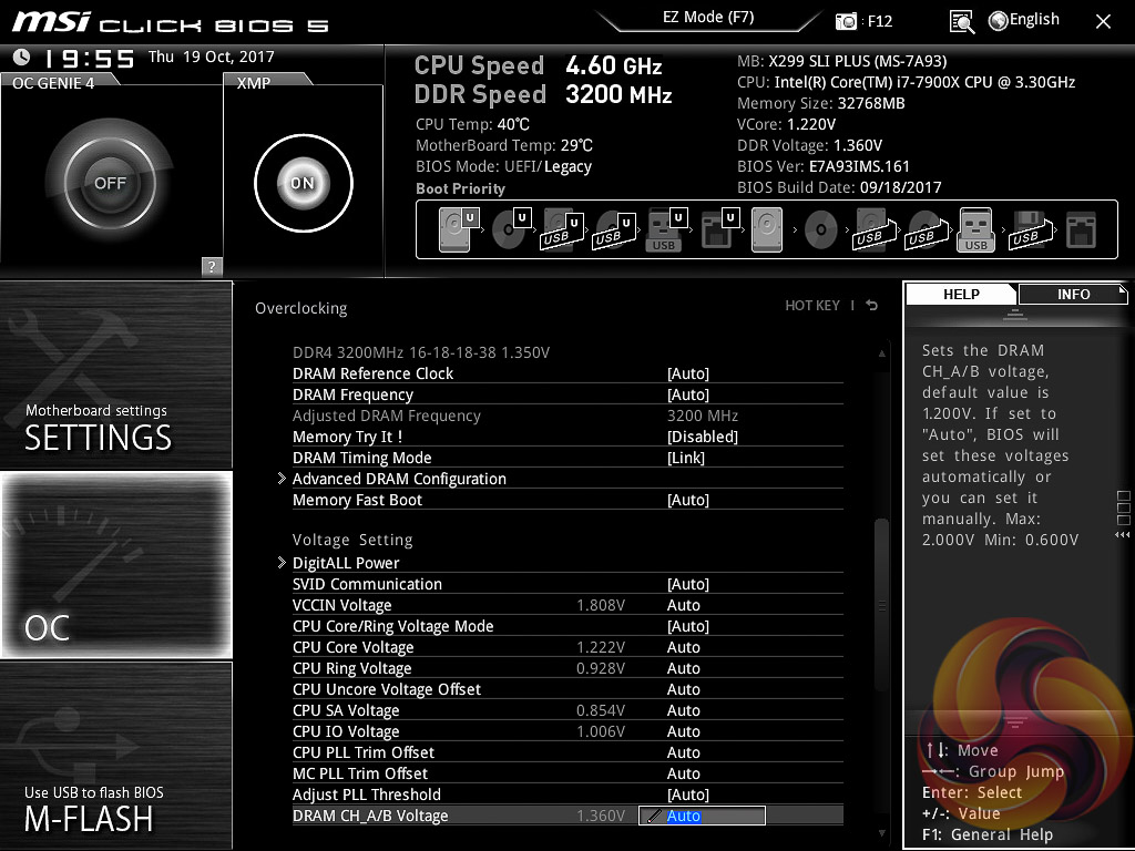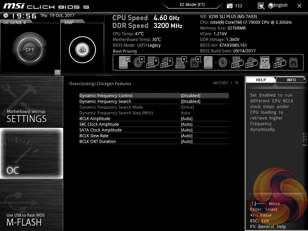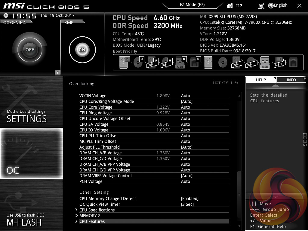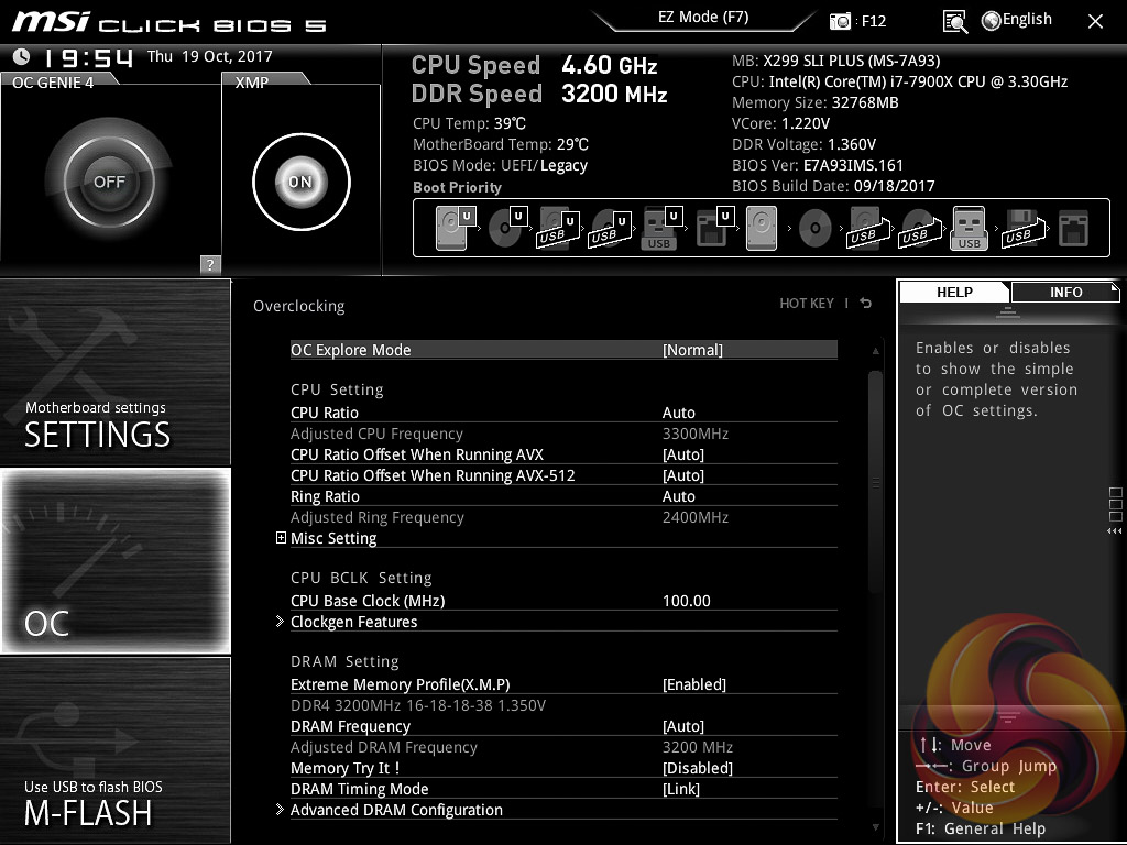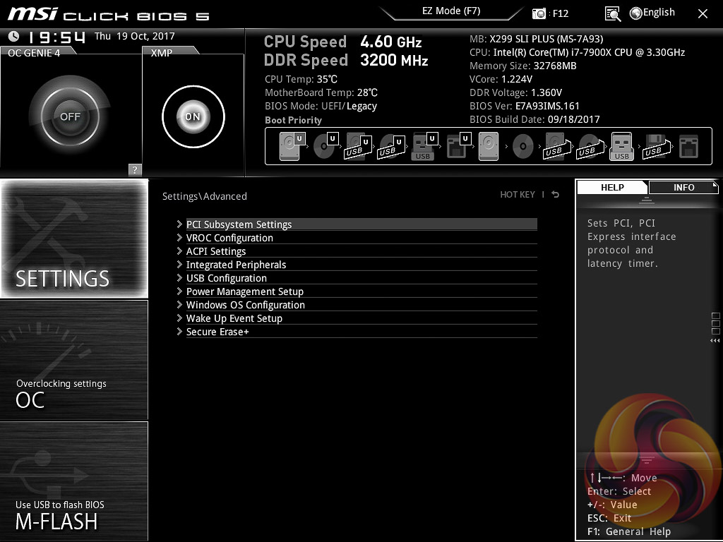 MSI’s UEFI has remained relatively consistent across its range of high-end motherboards for Intel platforms for the last few years. The MSI X299 SLI Plus sports version 5 of MSI’s Click BIOS which launches into an EZ Mode splash screen with an option to head into the advanced mode with the press of F7.