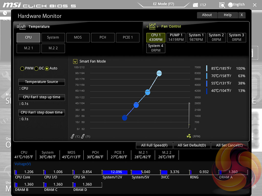 The fan controls are adequate for this motherboard allowing you to change the temperature source for each temperature-guided fan profile and the “step-up” time between each of the adjustment thresholds (hysteresis).