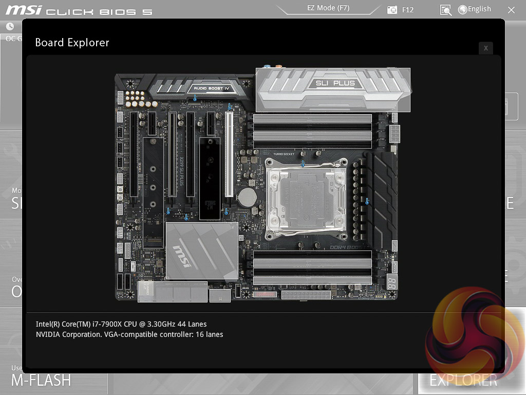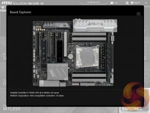 The last two tiles of the MSI UEFI refer to visual tools. Board Explorer is a visual interface for seeing what is connected to the various sections of the motherboard and some information about those connected entities. Hardware Monitor has more practical use in that it’s the primary method of changing fan profiles within the UEFI environment for each of the six fan headers.