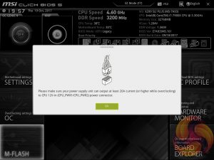 One of the newest features of MSI’s latest BIOS version for X299 is a reminder, when overclocking, that a PSU with at least 20 Amps of spare capacity for the 12v rail is needed. Note that any power requirement for the graphics card should be subtracted from the PSUs rated maximum +12 volt amperage to figure out what is left for the CPU.