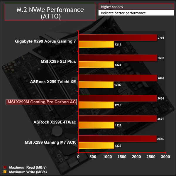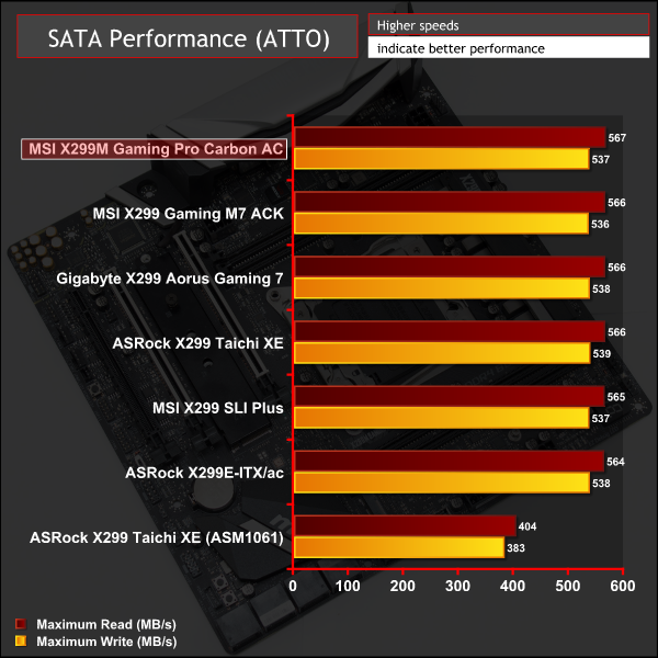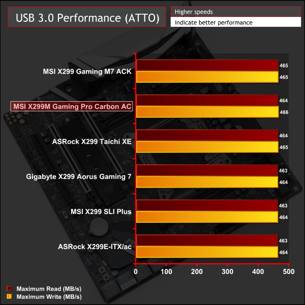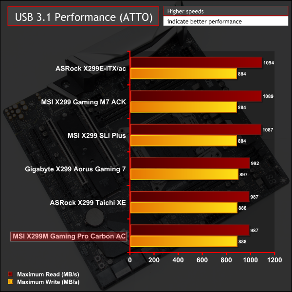USB 3.0 performance was as expected, USB 3.1 fell 100MB/s in peak read below expectations but this seems to be a reoccurring bug with some X299 motherboards and Windows that affects different motherboards with no clear pattern.