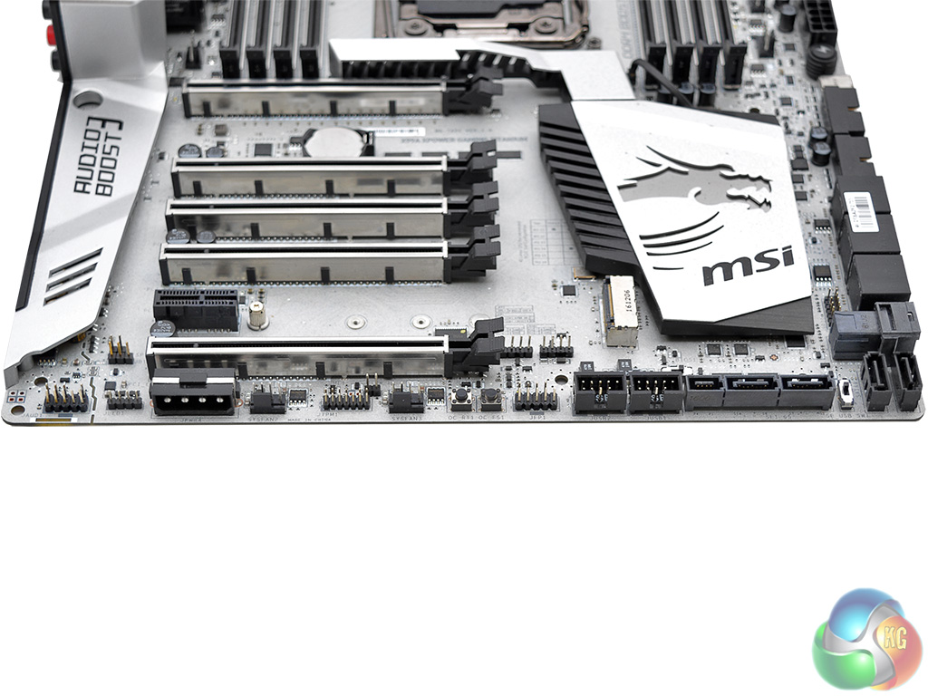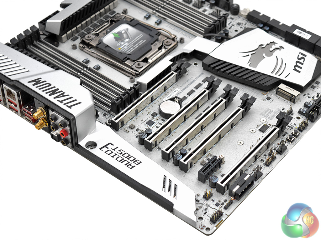 The MSI X99A XPower Gaming Titanium is a real eye-catcher with its shimmering silver colour scheme. MSI refuses to conform to the tired red-and-black theme for gaming motherboards which is a refreshing break for consumers. There is no standard RGB lighting setup for further design customisation but instead an RGB header to facilitate the usage of a third-party LED strip.