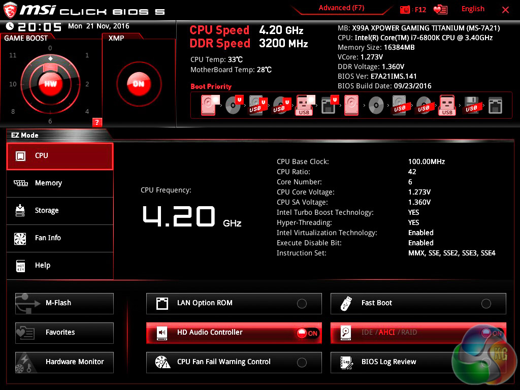 Click Bios 5 is presented in either the “EZ mode” or an advanced mode. The EZ mode is a single splash page which offers common functions like boot priority, XMP, OC Profiles (OC Genie 4) and numerous other things. The “advanced” mode is the complete UEFI environment that most of our readers will be accustomed to.