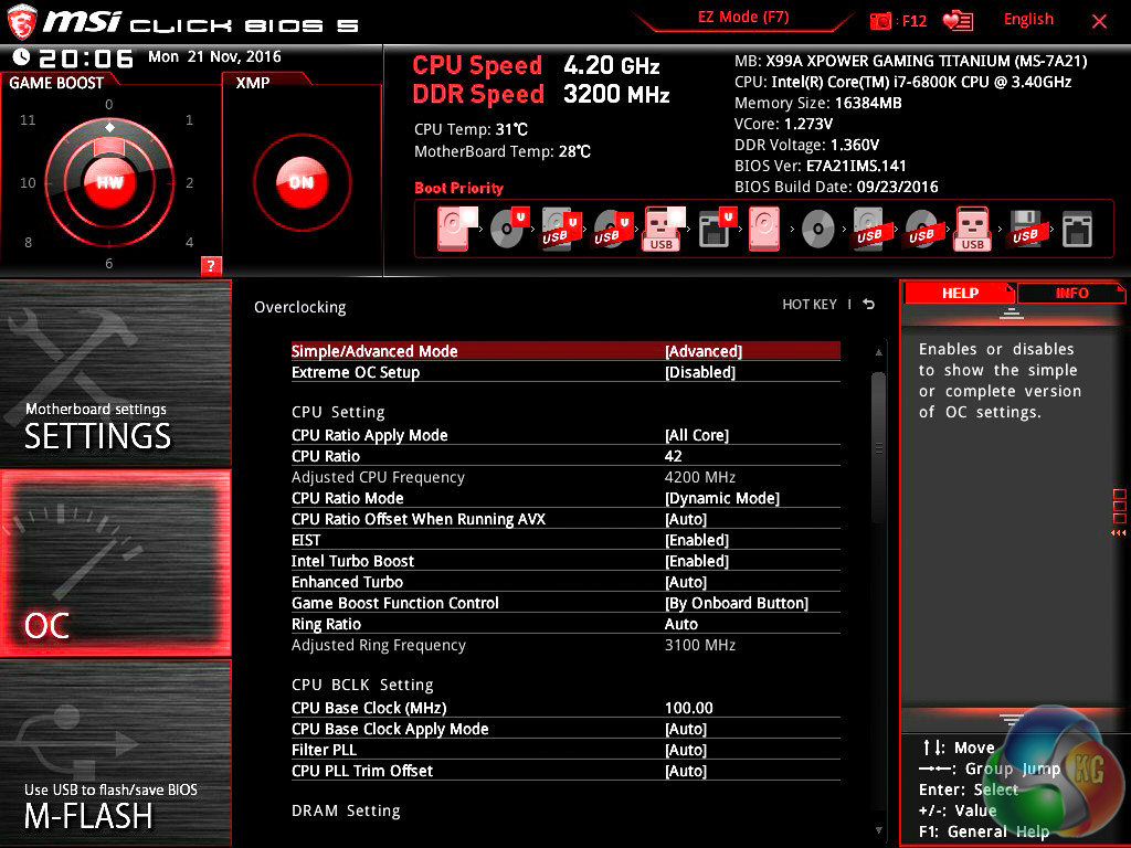 MSI attempts to offer a more intuitive advanced mode with further “difficulty” filtering in the OC tab. You can choose between a simple layout or an advanced one, the main difference being the simple layout hides the more obscure functions. Within the simple mode you can still overclock through the multiplier, increase the voltages, enable XMP, and so on.