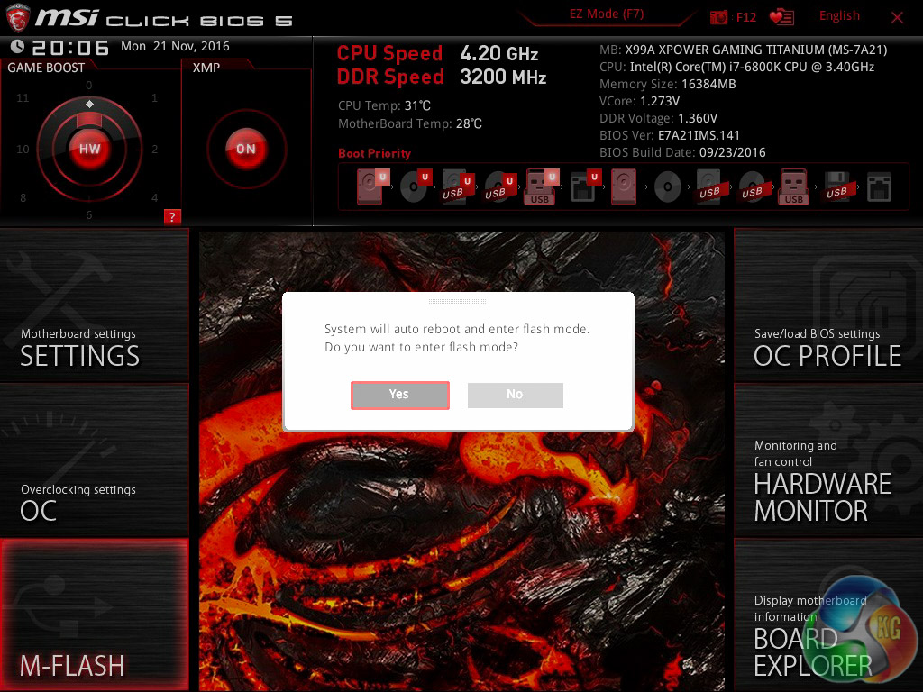 The MSI M-Flash tab and utility allows you to update the UEFI to the latest version by having a USB stick, formatted in FAT or NTFS, with a UEFI file in the root directory. It’s not as advanced as other BIOS update tools, including ASRock’s which updates straight from the internet, as you can only update from USB and the file has to be in the root directory. Nonetheless, it’s quick and it still does the job required.
