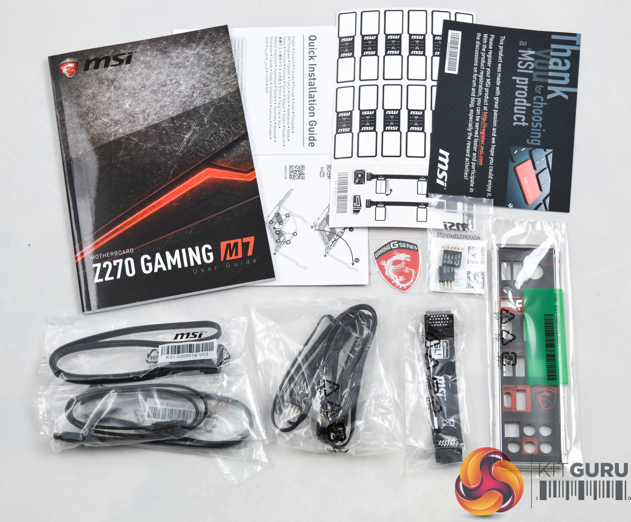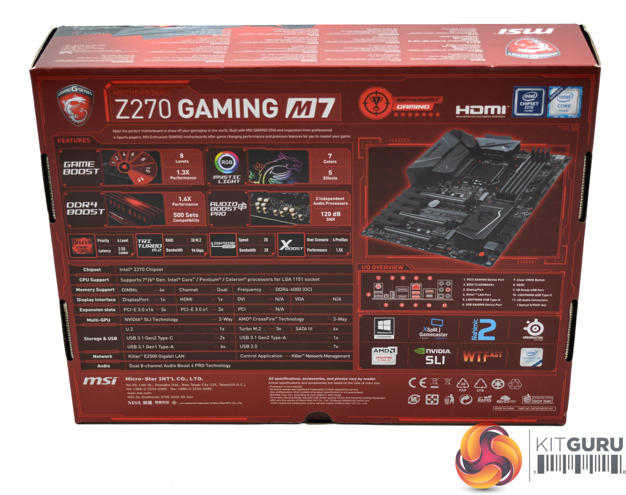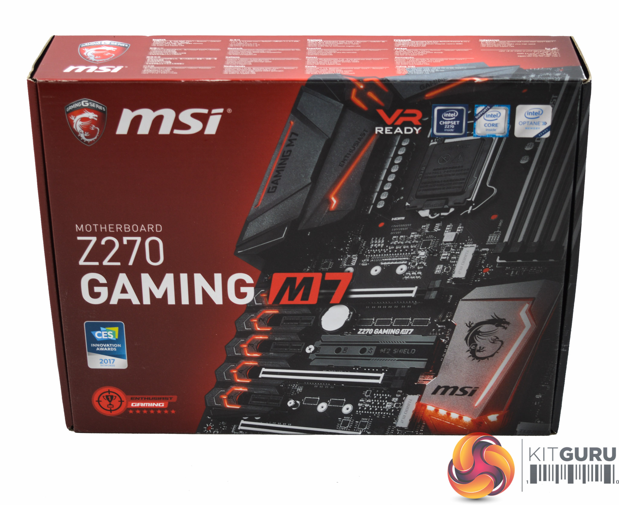 Packaging with the MSI Z270 Gaming M7 is tidy and to the point. MSI outlines all the key features including its uprated dual-codec audio design, support for RGB lighting and enhanced DDR4 memory compatibility.