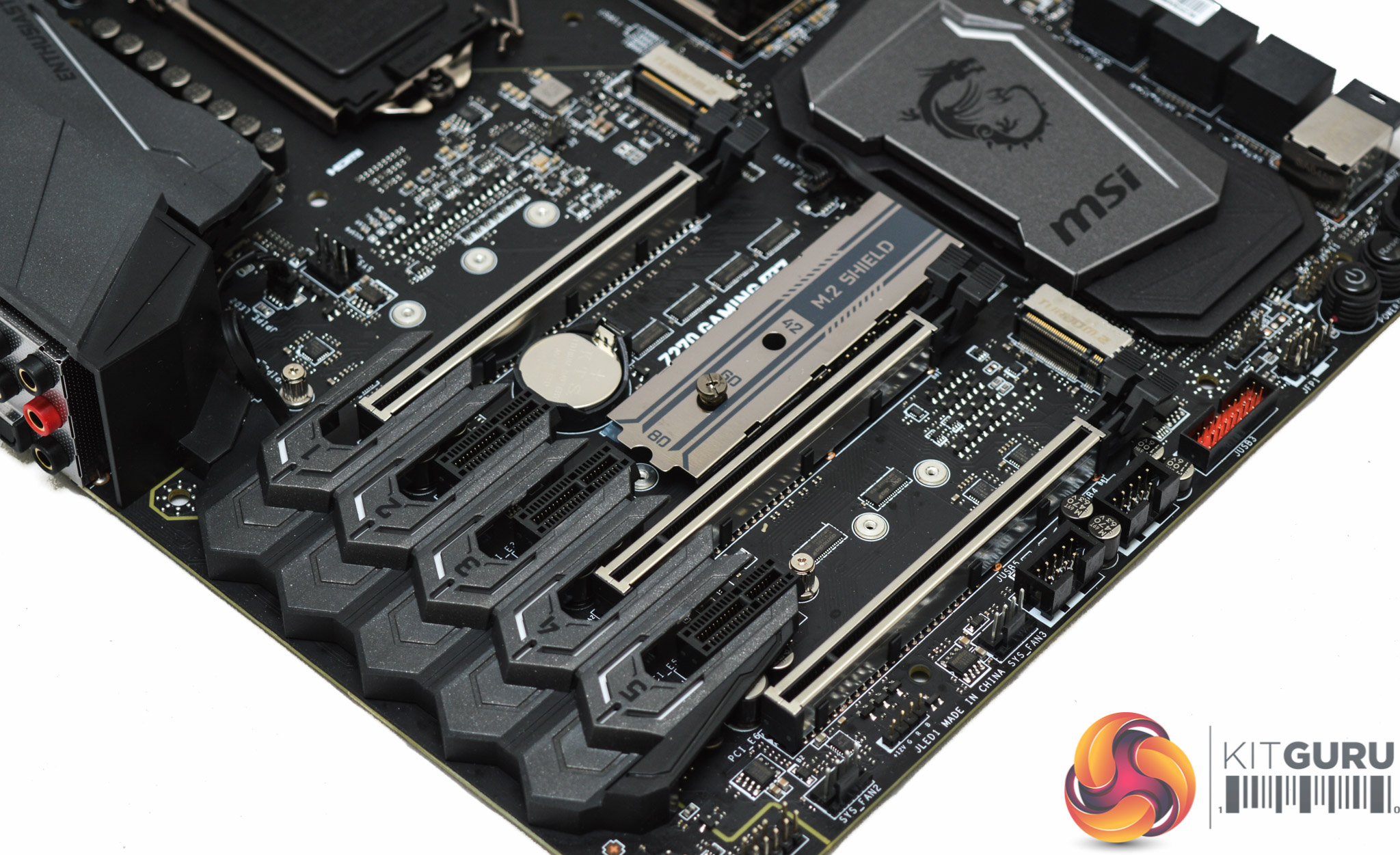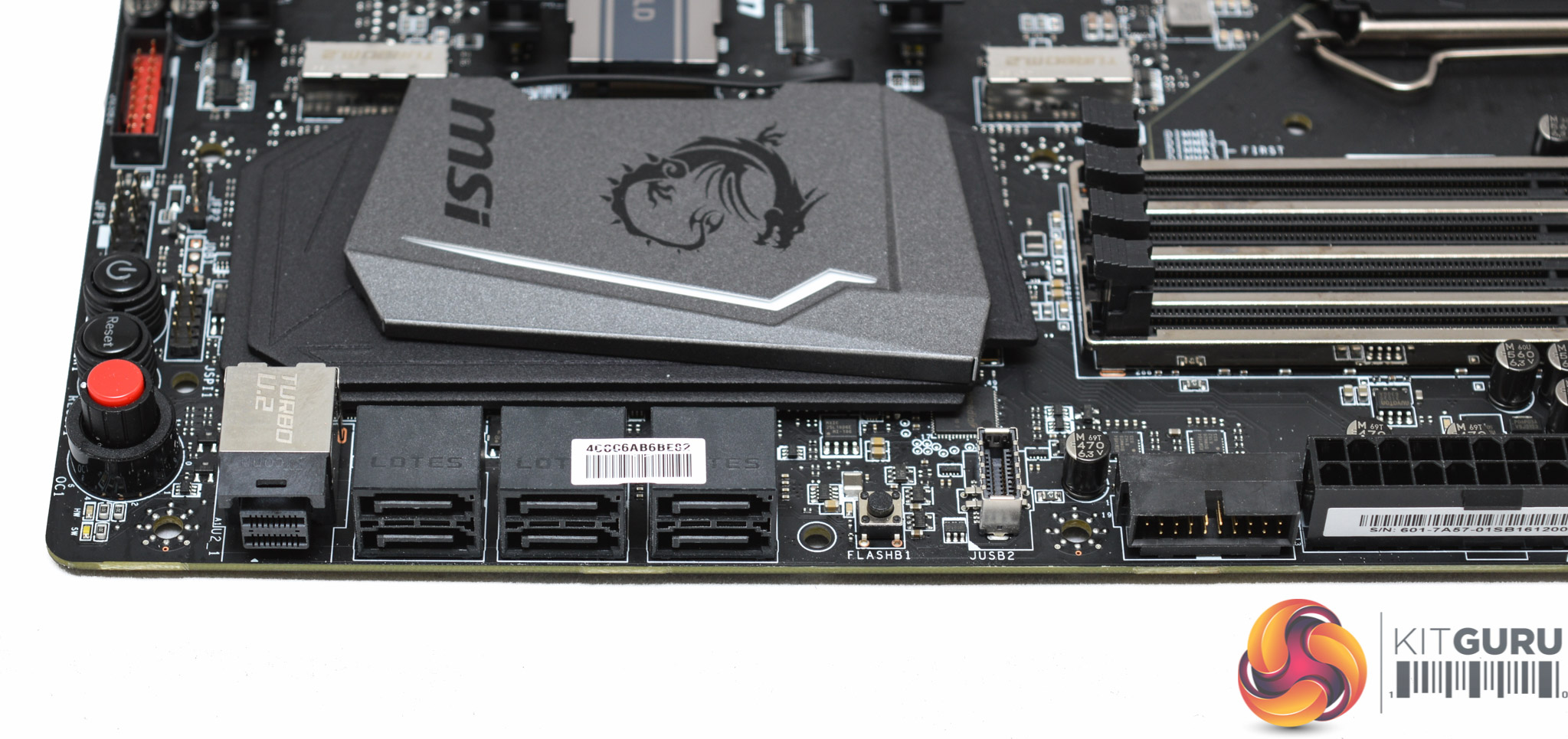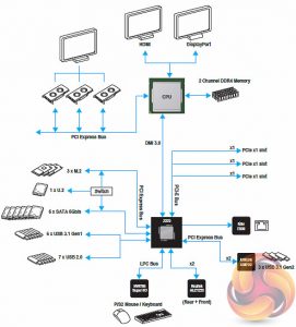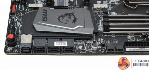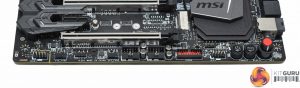 Between the PCIe lanes you can find all three M.2 ports which can run up to PCIe 3.0 X4 32Gbps. The central M.2 port has MSI's “M.2 Shield” which is intended to draw heat away from the M.2 drives installed beneath. Each of the three PCIe X16 lanes has slot shielding. The electrical layout of this MSI motherboard, including the PCIe lanes, is denoted above. There is bandwidth sharing between the U.2 port, third M.2 port and SATA ports 5/6 to be wary of.