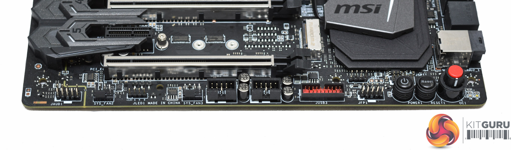 Near the memory lanes there is a debug LED, debug code reader, a number of OC headers/jumpers. Alongside the 24 pin is a right-angled USB 3.0 header and there's also a SYS fan header nearby. The strange-looking internal port marked “JUSB2” is to support cases with front panel USB Type-C cables.