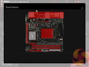 The last two tiles of the MSI UEFI refer to tools. Board Explorer is a visual interface for seeing what is connected to the various sections of the motherboard and some information about those connected entities. Hardware Monitor has more practical use in that it’s the primary method of changing fan profiles within the UEFI environment for each of the three fan headers.