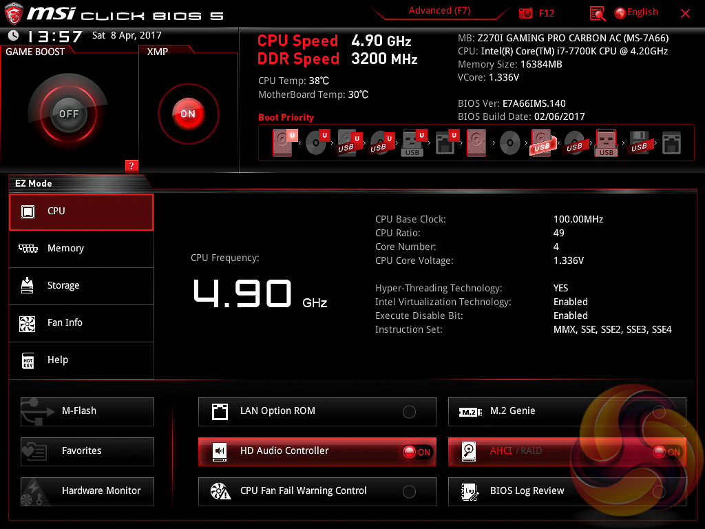 MSI’s UEFI launches into EZ Mode by default, but can launch into Advanced mode instead by pressing F7. The EZ Mode splash page holds the key settings like automated overclocking, boot order, fan profiles, M-Flash and XMP.