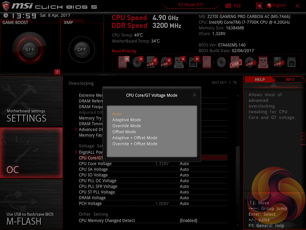 The most important of those is the ability to pick how voltage is applied and by default the CPU voltage mode is Auto. We are not sure which mode auto selects once you key in a voltage but by enabling Expert mode you can pick from Adaptive, Override, Offset, Adaptive + Offset or Override + Offset.
