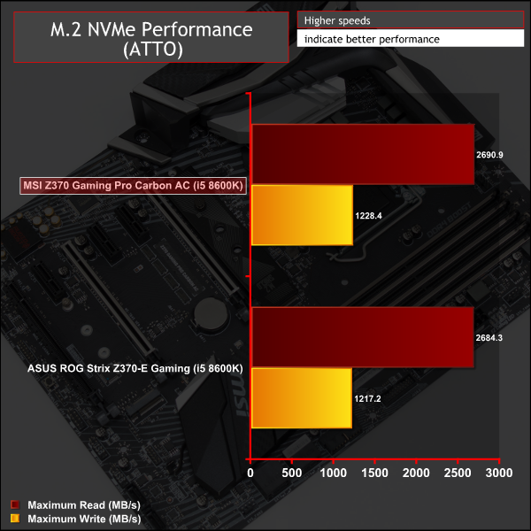M.2 performance continues to max out the drive, as with Z270, and MSI's M.2 Shield did a good job in keeping the SSD temperature out the throttle zone even after prolonged heavy loading.