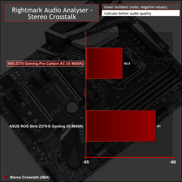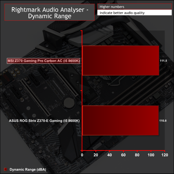 Audio performance is marked as Very Good overall with 6 Excellent, 1 Very Good and 1Good. MSI does well to squeeze every last drop of performance out of the Realtek ALC1220 codec, which has been a mainstay of Z270, X299, X370, X399 and other high-end motherboards for a while now.