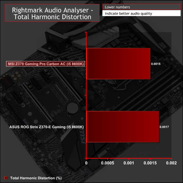 Rightmark Audio Analyser is a freeware benchmarking utility designed to objectively test the performance characteristics of audio solutions. We setup a line-in line-out loop and execute the record/playback test before generating the results report you see below. A sampling mode of 24-bit, 192 kHz is tested where available. If unavailable the closest alternative operating mode available is used and clearly marked.