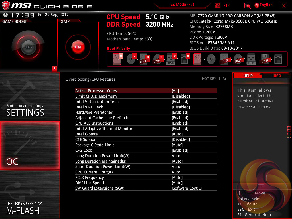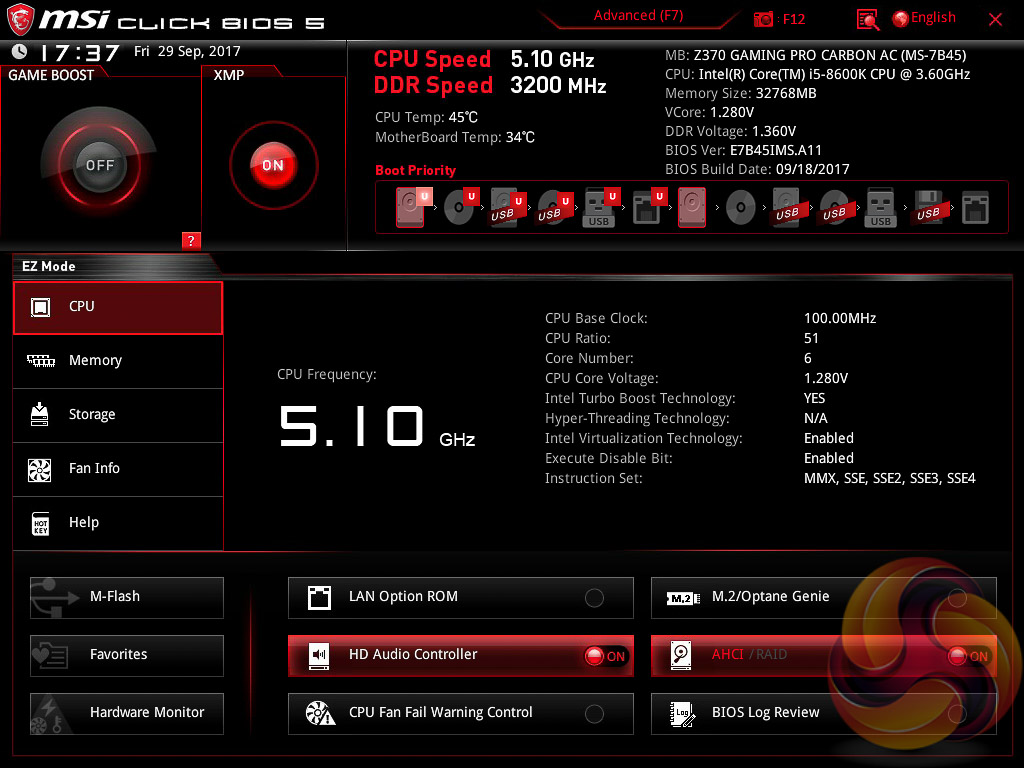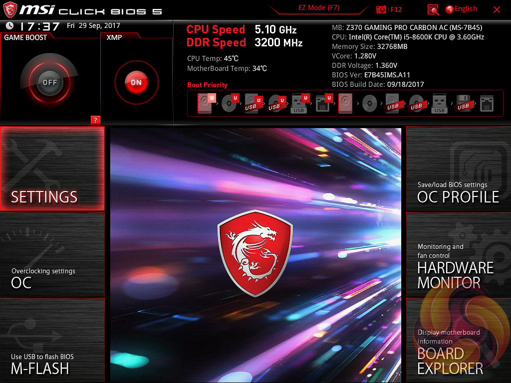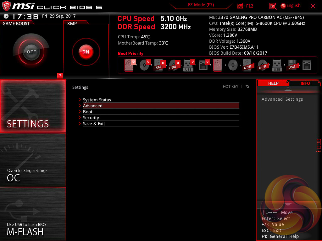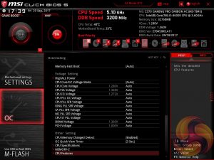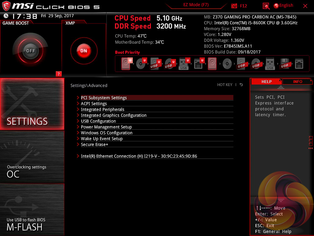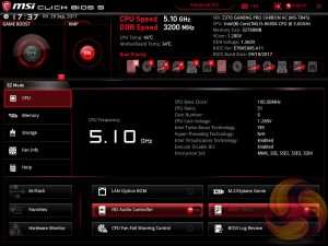 MSI’s UEFI has remained relatively consistent across its range of high-end motherboards for Intel platforms for the last few years. The MSI Z370 Gaming Pro Carbon AC sports version 5 of MSI’s Click BIOS which launches into an EZ Mode splash screen with an option to head into the advanced mode with the press of F7.
