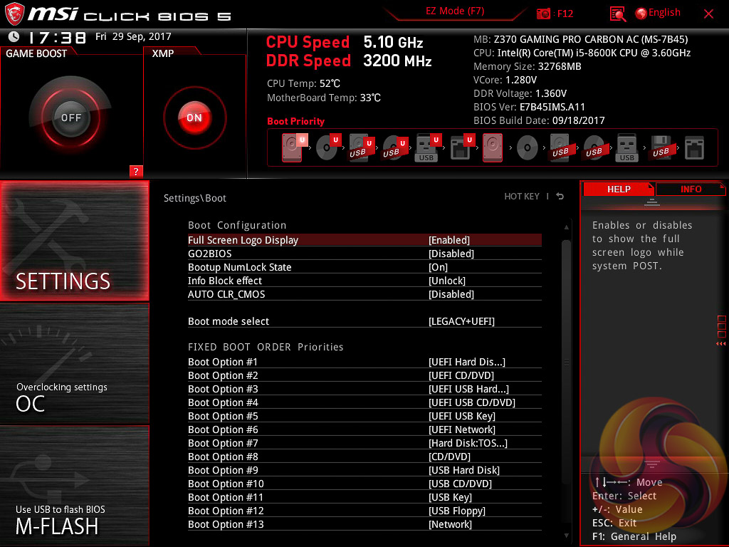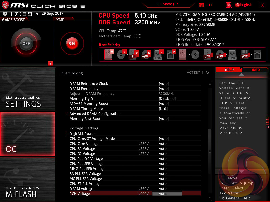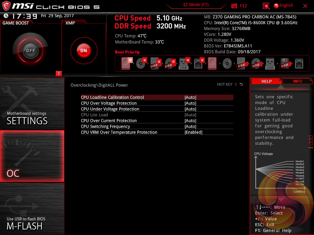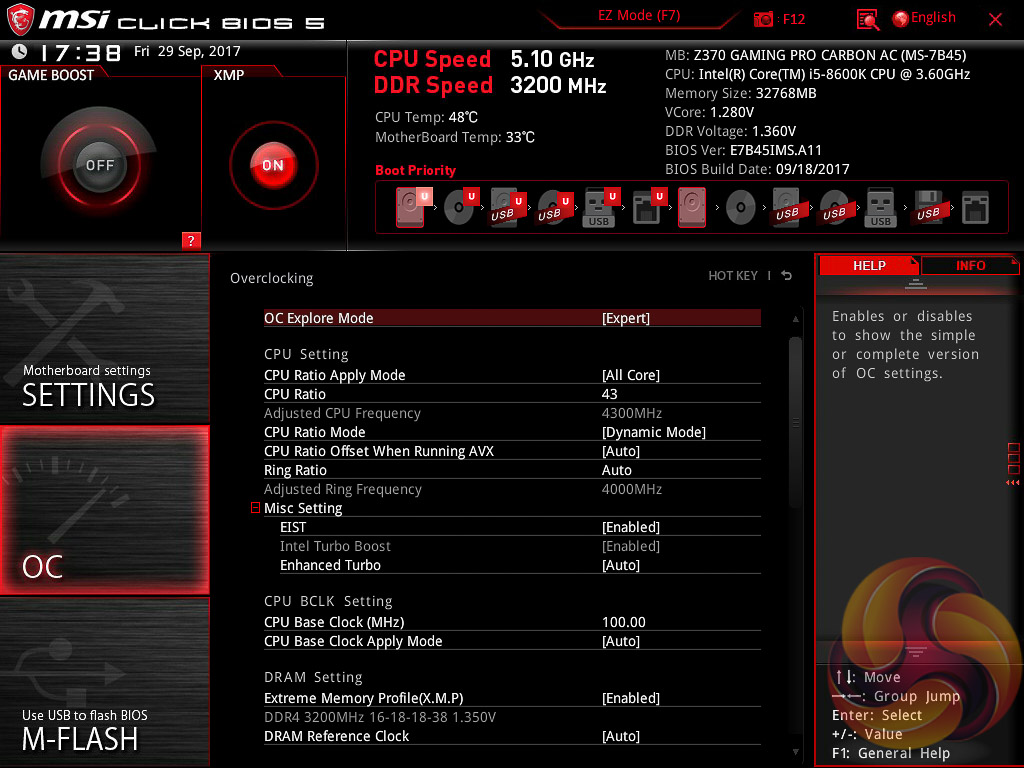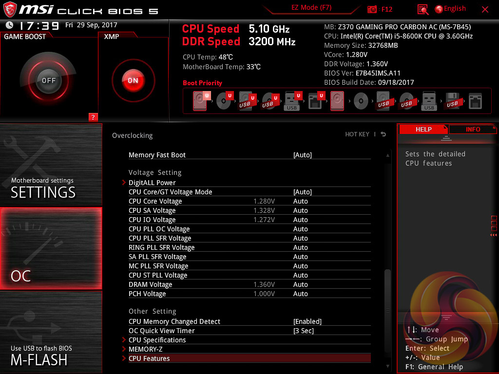 MSI’s UEFI has remained relatively consistent across its range of high-end motherboards for Intel platforms for the last few years. The MSI Z370 Gaming Pro Carbon AC sports version 5 of MSI’s Click BIOS which launches into an EZ Mode splash screen with an option to head into the advanced mode with the press of F7.