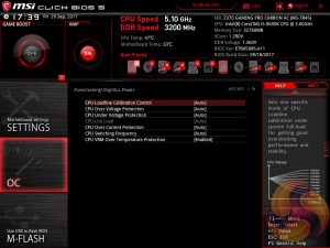The range of LLC options is extensive too with Mode 1 (most aggressive) to Mode 8 (least aggressive) as well as an option for No overvolting, which is even less aggressive on the voltage than Mode 8. From our testing mode 2 will ensure an almost perfect voltage stability under load, mirroring the voltage specified in BIOS, while mode 3 isn’t far off either. The visual diagram MSI provides within the BIOS is useful in ascertaining the behaviour of each CPU LLC mode.
