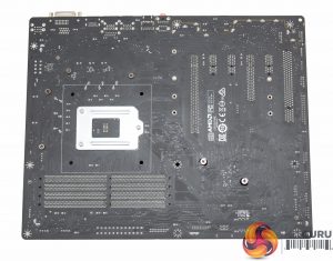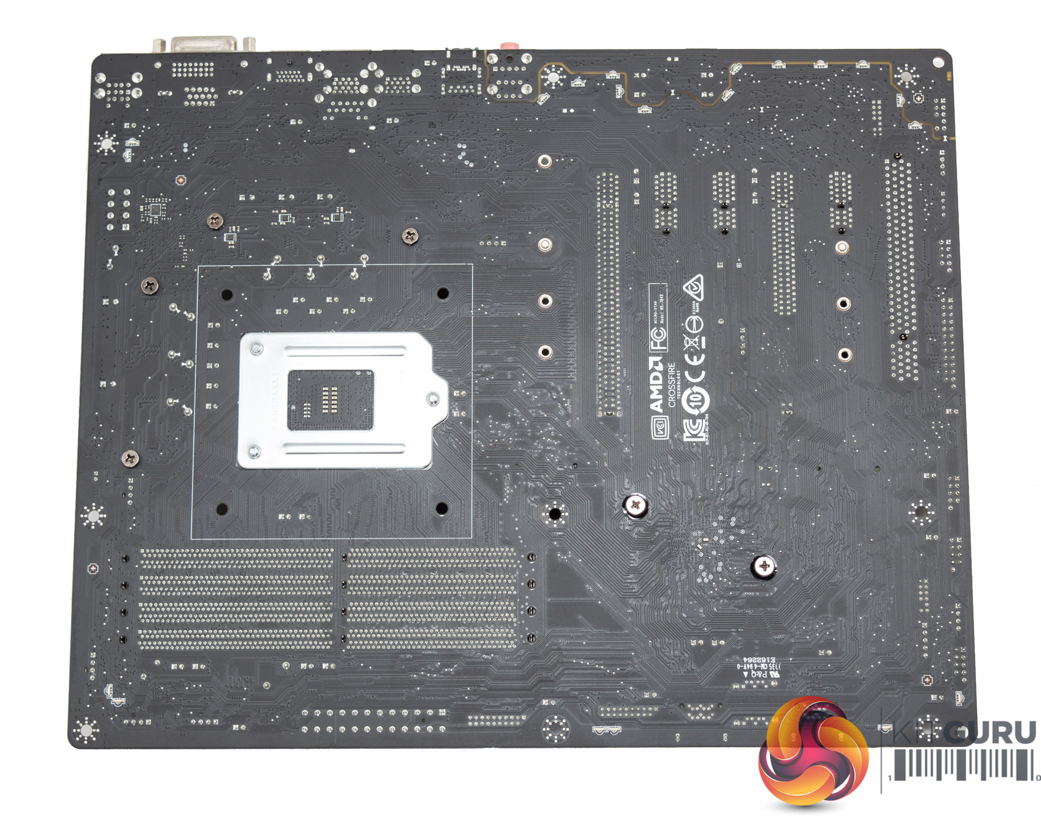 The underside of the motherboard is fairly sparse and uses cross-head screws throughout. There a few nondescript ICs underneath related to the CPU VRM that probably assist with voltage smoothing and stabilisation.