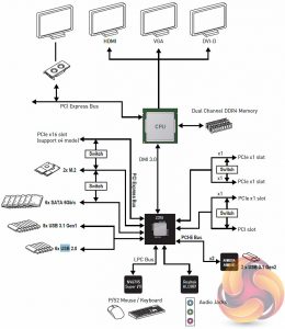 On the subject of bandwidth sharing the above block diagram demonstrates the various bandwidth sharing constraints present on this motherboard. The main bandwidth switching (either/or) is between: