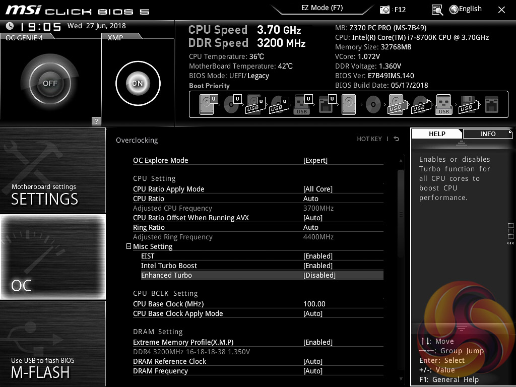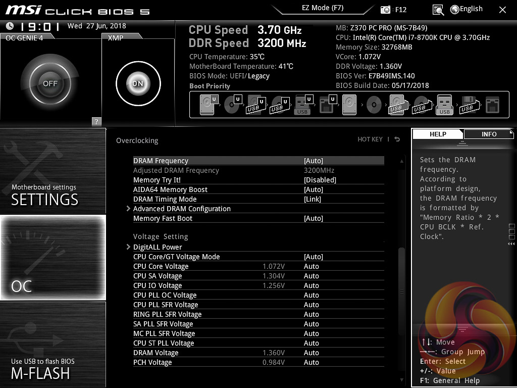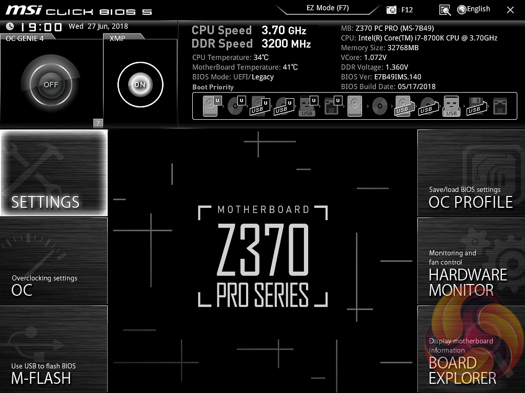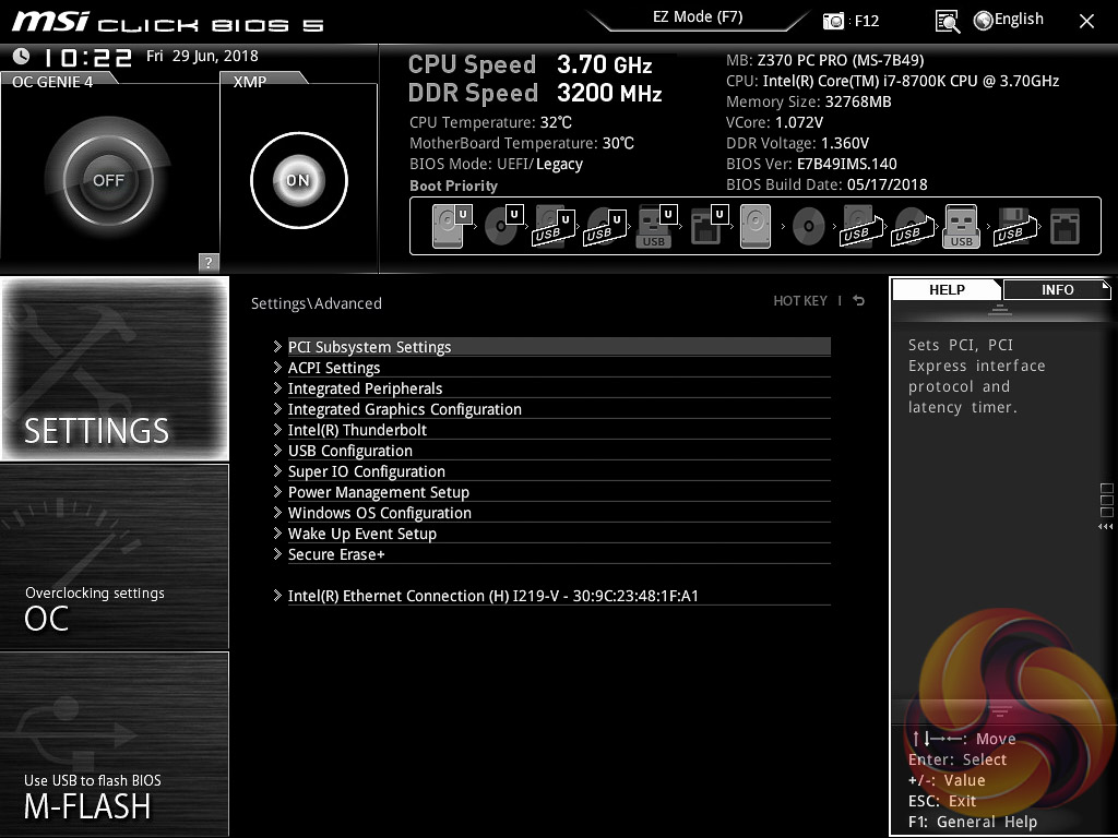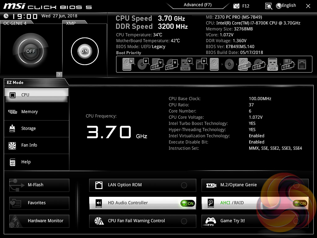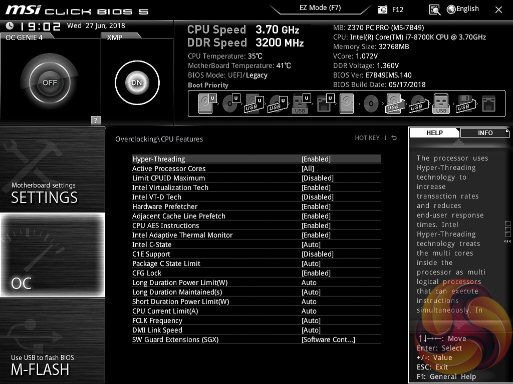 MSI’s UEFI has remained relatively consistent across its range of high-end motherboards for Intel platforms for the last few years. The MSI Z370 PC Pro sports version 5 of MSI’s Click BIOS which launches into an EZ Mode splash screen with an option to head into the advanced mode with the press of F7.