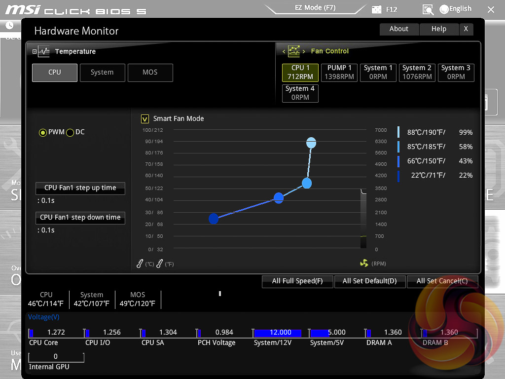 The fan controls are adequate for this motherboard allowing you to change the temperature source for each temperature-guided fan profile and the “step-up” time between each of the adjustment thresholds (hysteresis).