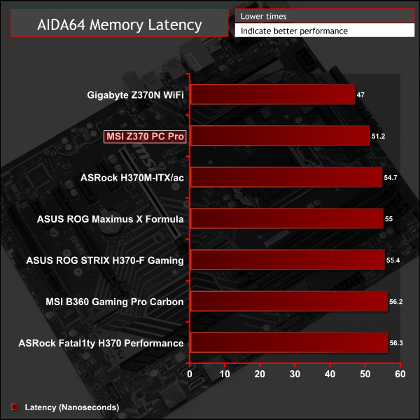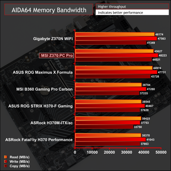 Memory performance is also as expected, note the advantage over H370 and B360 from being able to use faster 3,200MHz memory. H370 and B360 are limited to 2,666MHz.