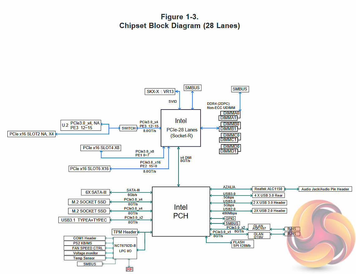 The PCIe lane configuration depends on the CPU used – 28-lane CPUs naturally have more limitations than 44-lane CPUs. The provided block diagrams give a clear indication on what PCIe bandwidth is shared between which slots and ports.
