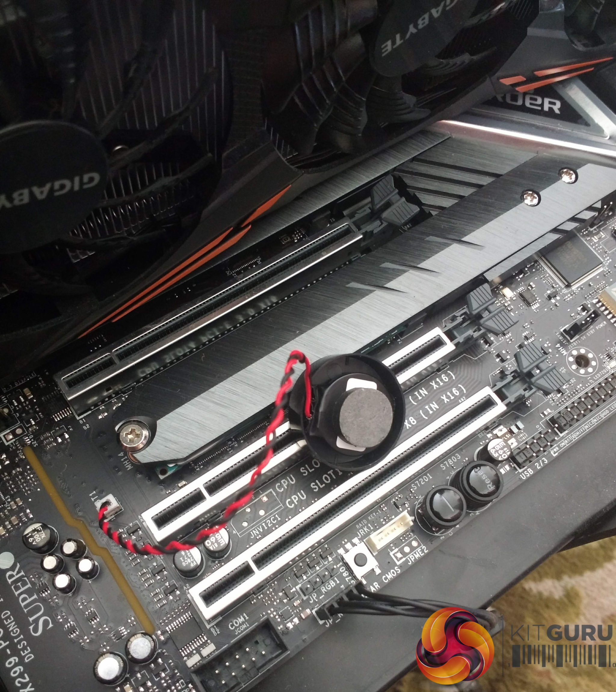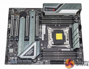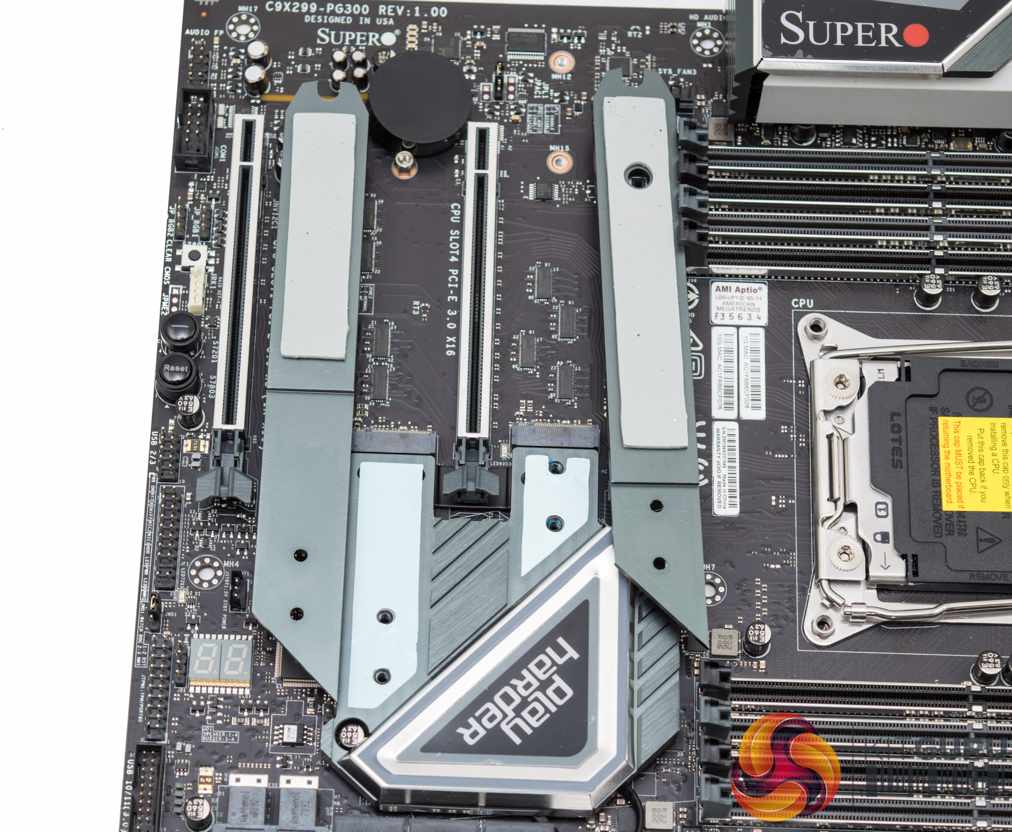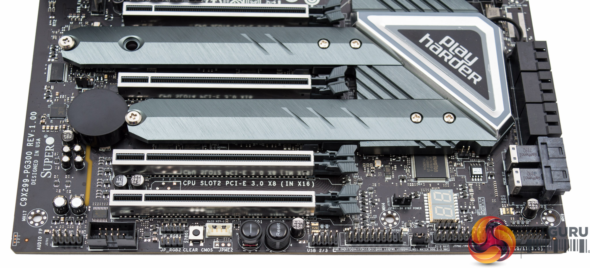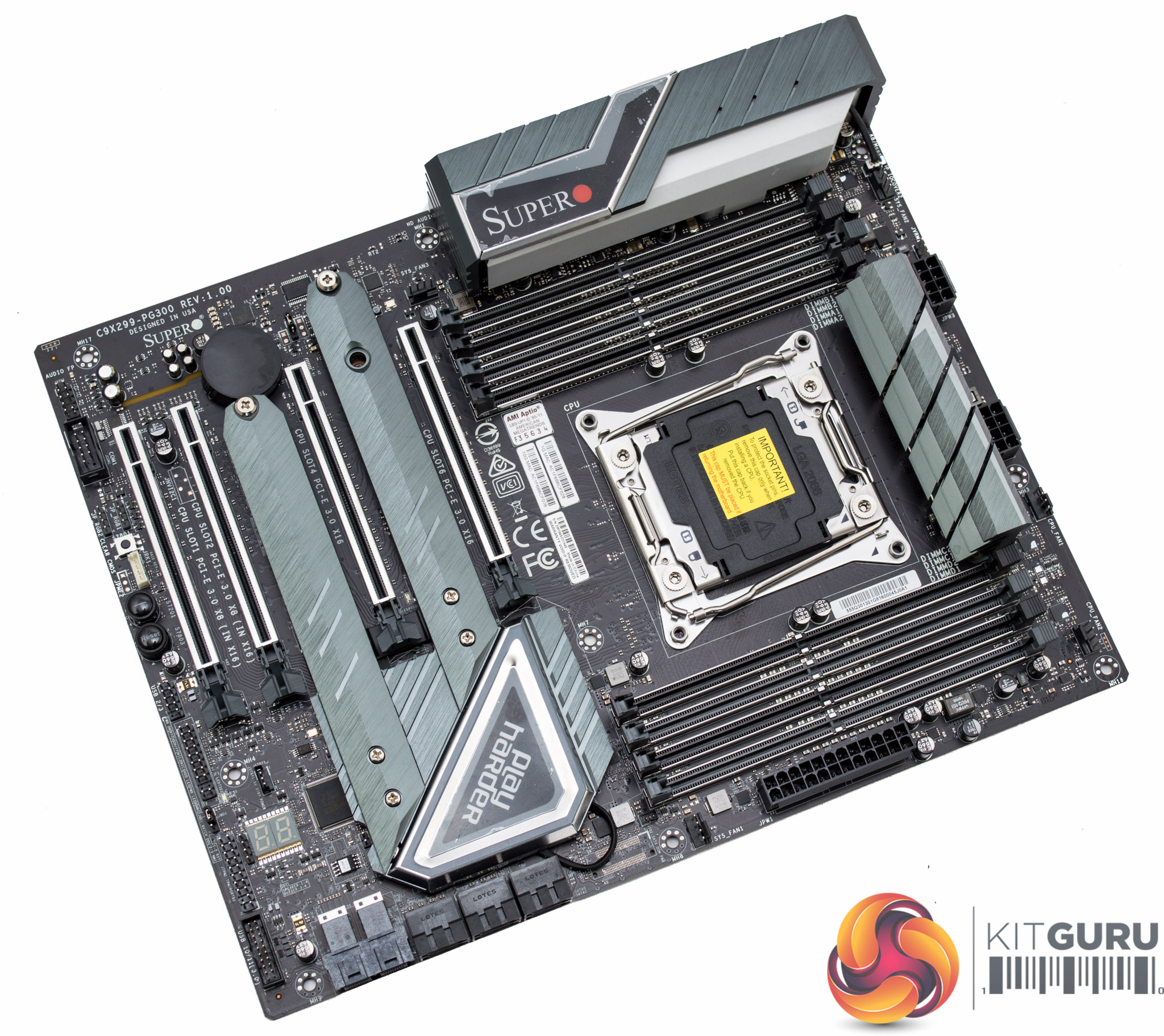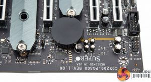 The design of the SuperO C9X299-PG300 is quite neutral and should suffice for most prospective buyers. The colour scheme is a mix of a number of shades of grey all on top of a matte black PCB. The only design flair that stands out as potentially polarising is the “Play Harder” slogan printed on a heatsink sticker. For the fussy customer with some patience, and a heat gun, this can likely be removed.