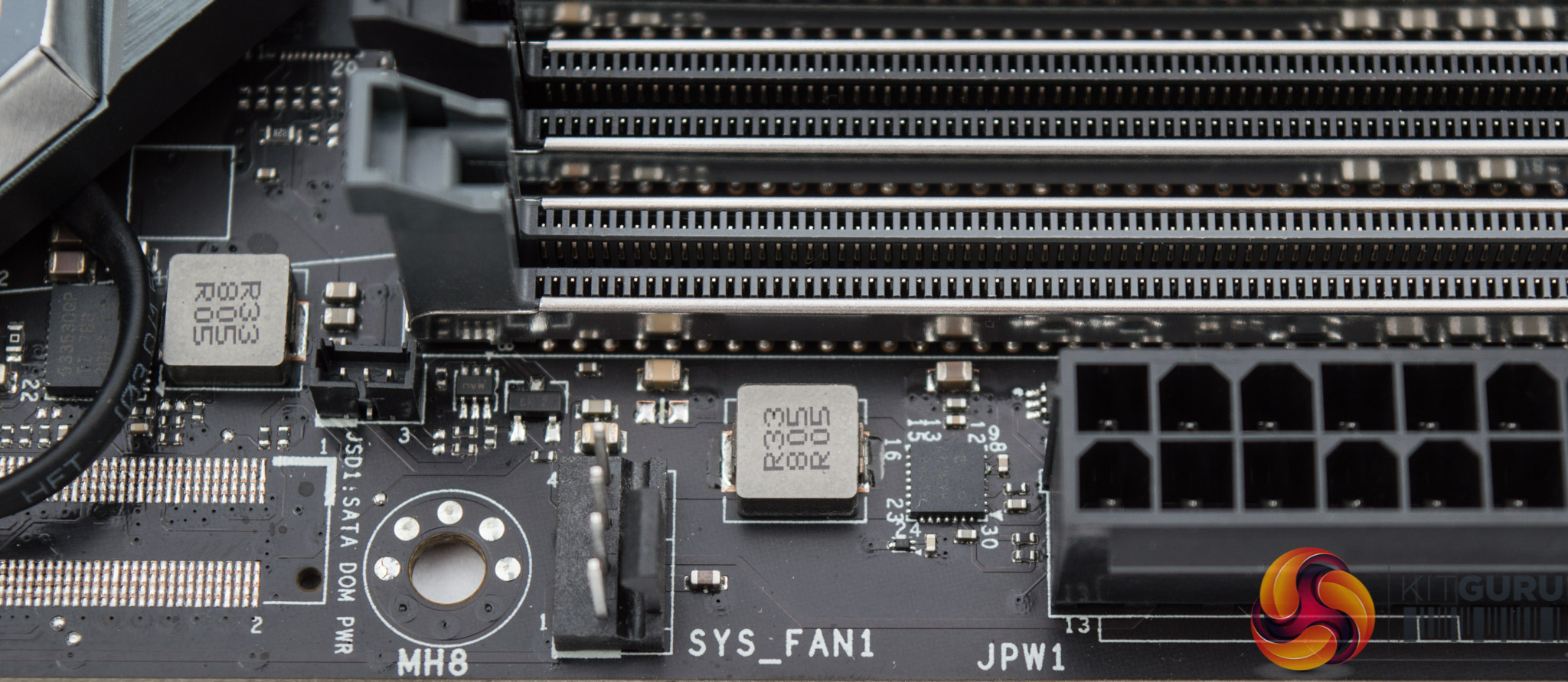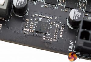 These TD21240 power stages are rated for a maximum average current of 40amps with a typical efficiency between 91 to 94% according to the data sheet. These are less powerful than the TDA21470 units used to supply the CPU, rated for 40A versus 70A, but given these do considerably less work they are highly over-engineered for the job.