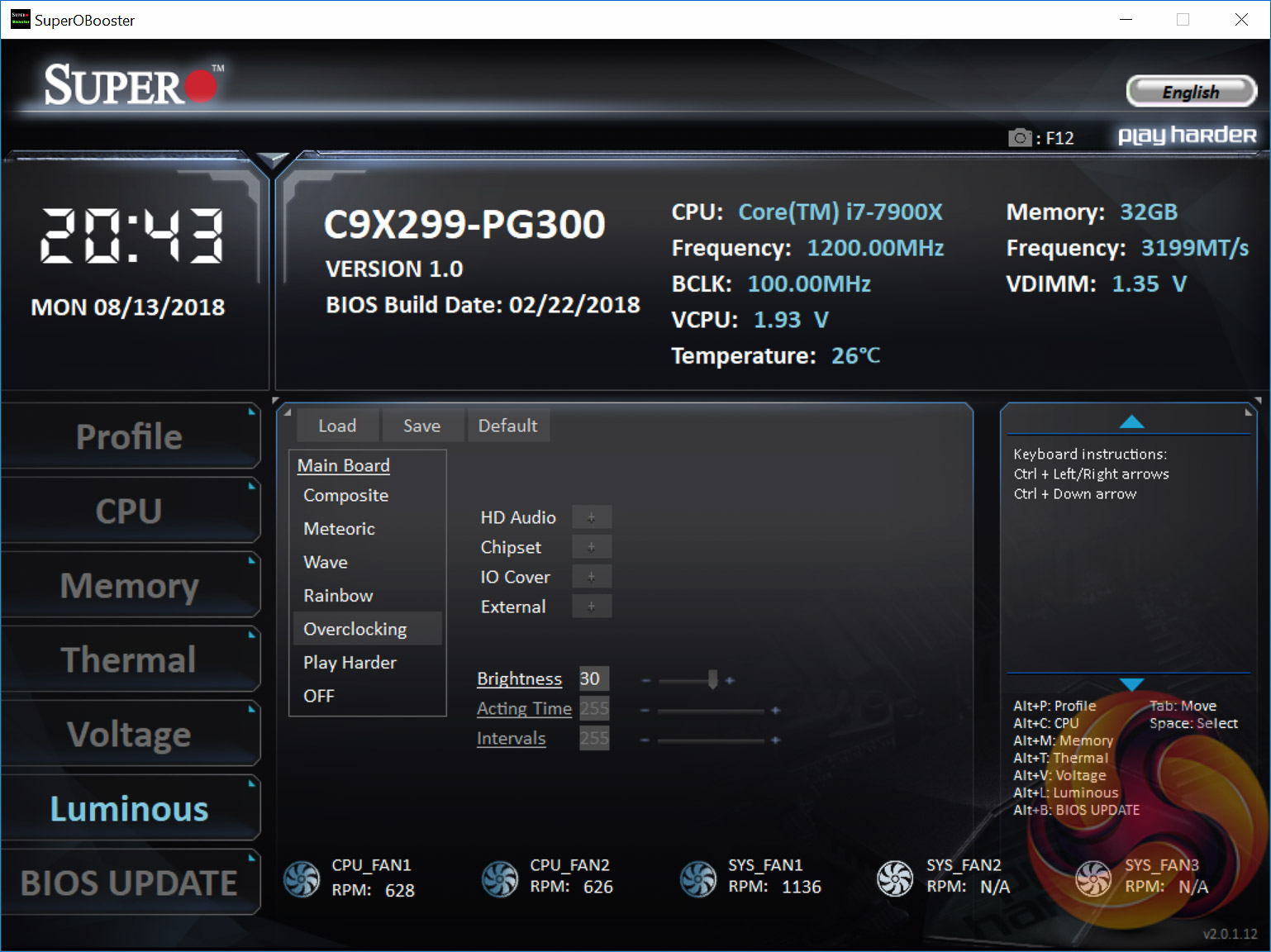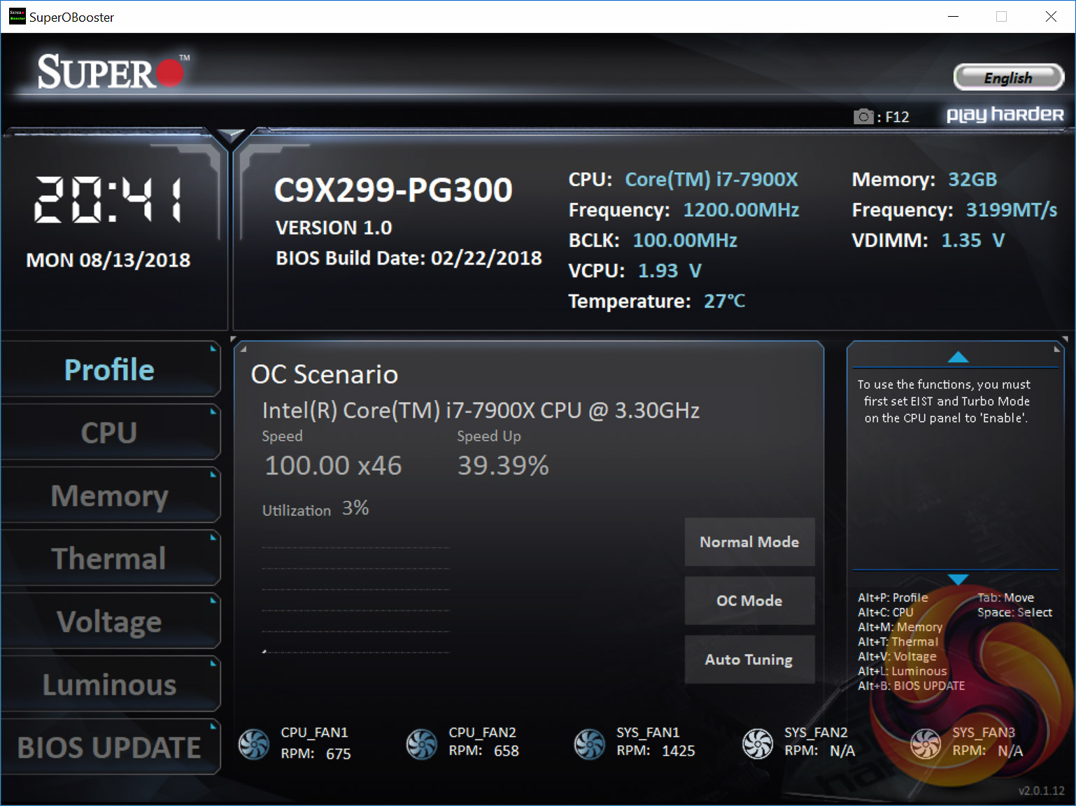 Supermicro's SuperO Booster software is the main software package for the Supermicro C9X299-PG300. It is a somewhat similar idea to the likes of ASUS AI Suite, ASRock A-Tuning/F-Stream, Gigabyte EasyTune and MSI Command Center, except better unified. Supermicro earns credit for convenience since all its relevant and useful functionality sits inside this single software package.
