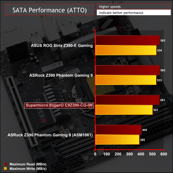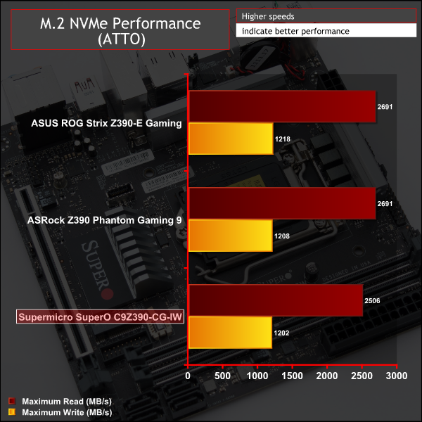 All storage performance (M.2, USB and SATA) on this motherboard was slightly behind everything else we've tested, both Z390 but also previous Z370 and X299 motherboards. Even after a clean copy of Windows 10 version 1809, the performance differential remained.