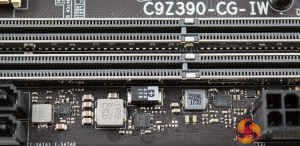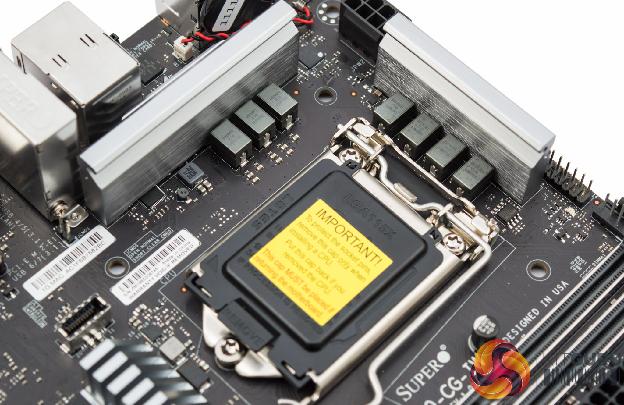 Unlike on Supermicro's Z370 model, there are two CPU VRM heatsinks for both MOSFET areas. On this motherboard Supermicro has split the VRM into 4 and 3, even though it operates as 5+2, which means both heatsinks cool the VCore VRM. This is important as the “+2” phases for the VCC GT (iGPU) do not get a great deal of use so having the heatsink also cooling part of the VCore makes a lot of sense, even if it's only 1 VCore phase.