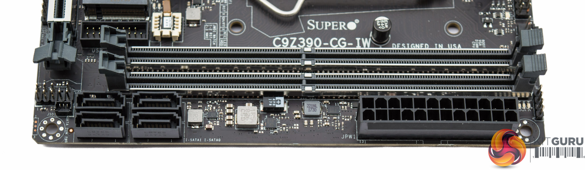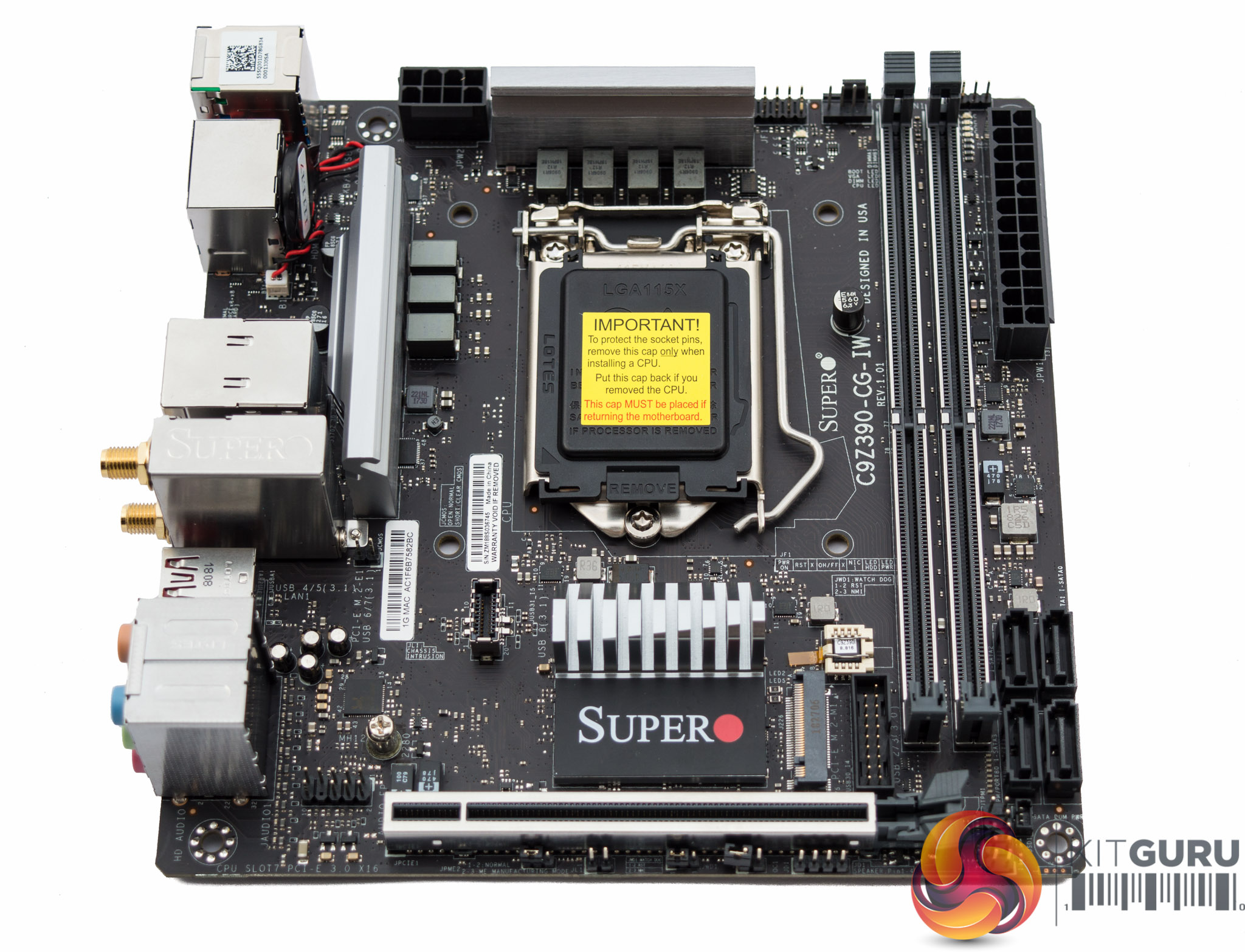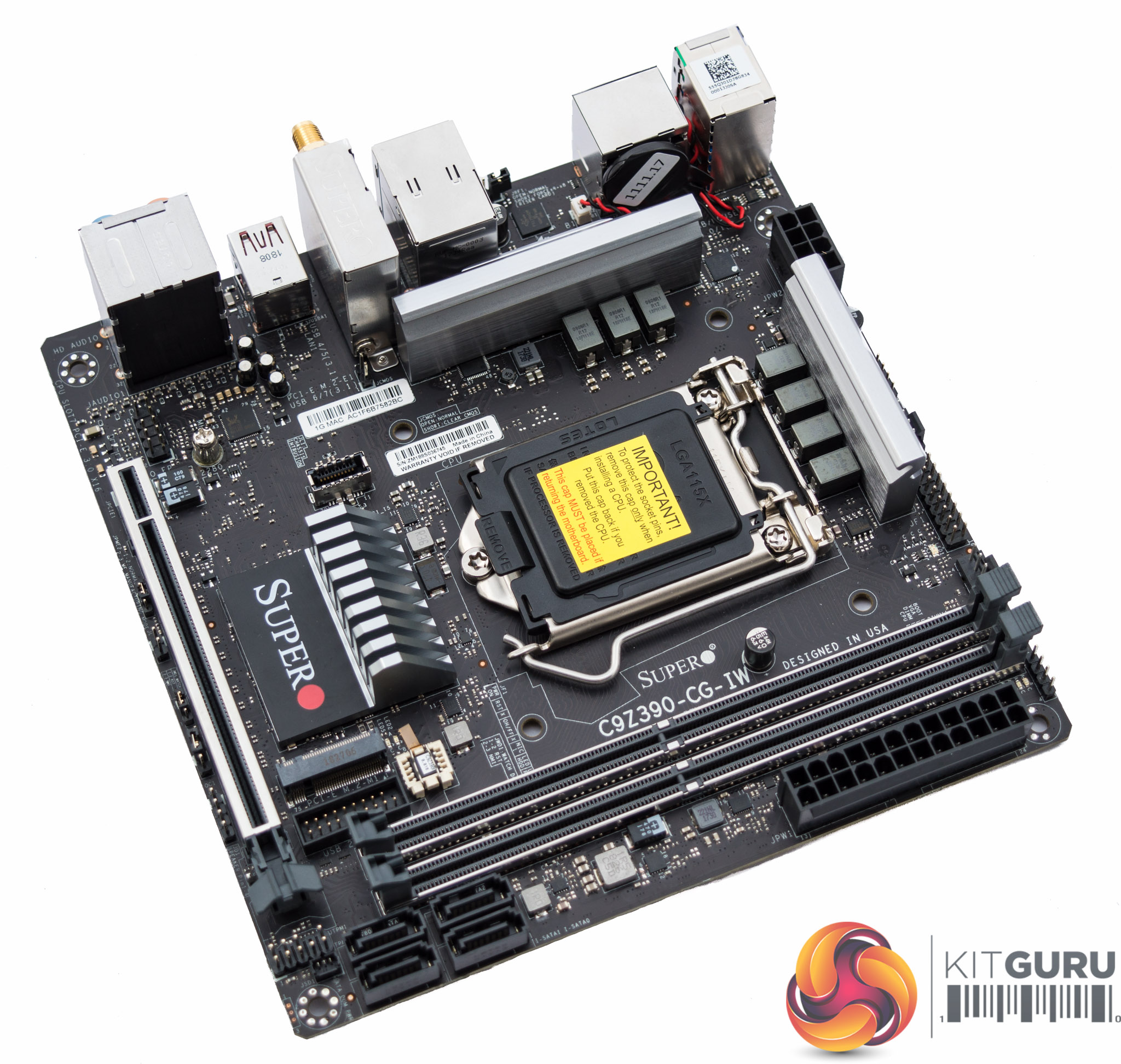 The styling of mini-ITX motherboards is always broadly similar given the limited space for customisation after placing non-negotiable elements like the CPU socket, PCIe lane and memory slots. Supermicro's SuperO C9Z390-CG-IW is particularly plain as there's no significant styling on the VRM heatsinks, neither on the chipset heatsink. That's no bad thing as there aren't many mini-ITX cases with large display windows. Even in a windowed-case this motherboard does fine with its mostly-black aesthetic and onboard RGB lighting.