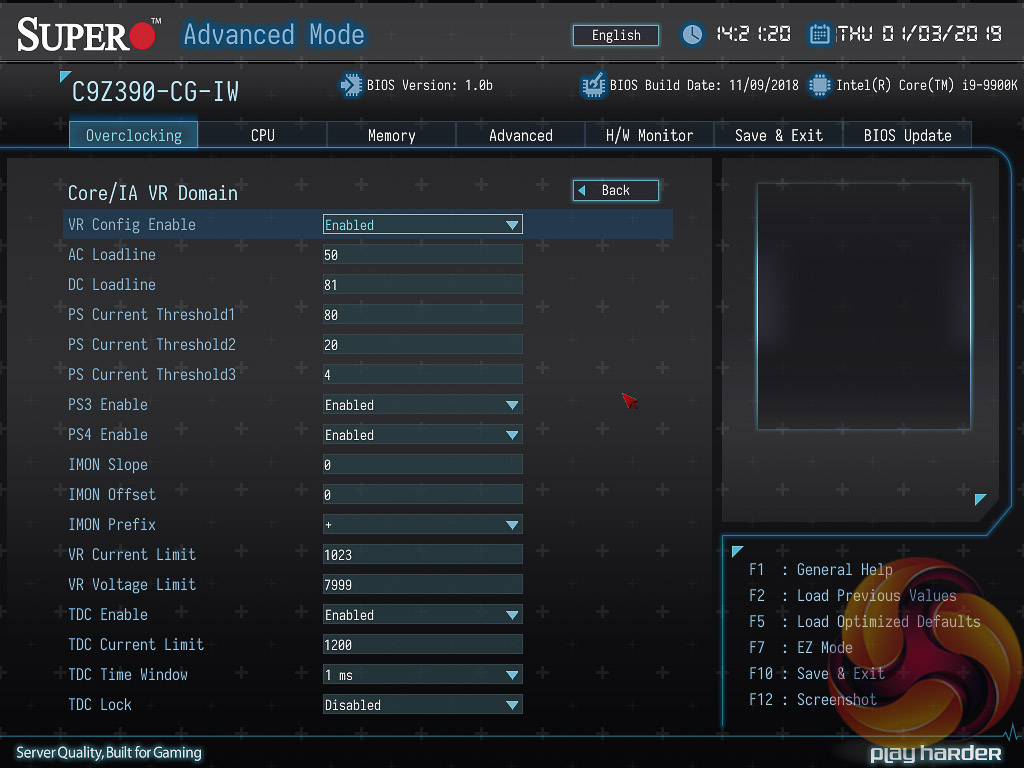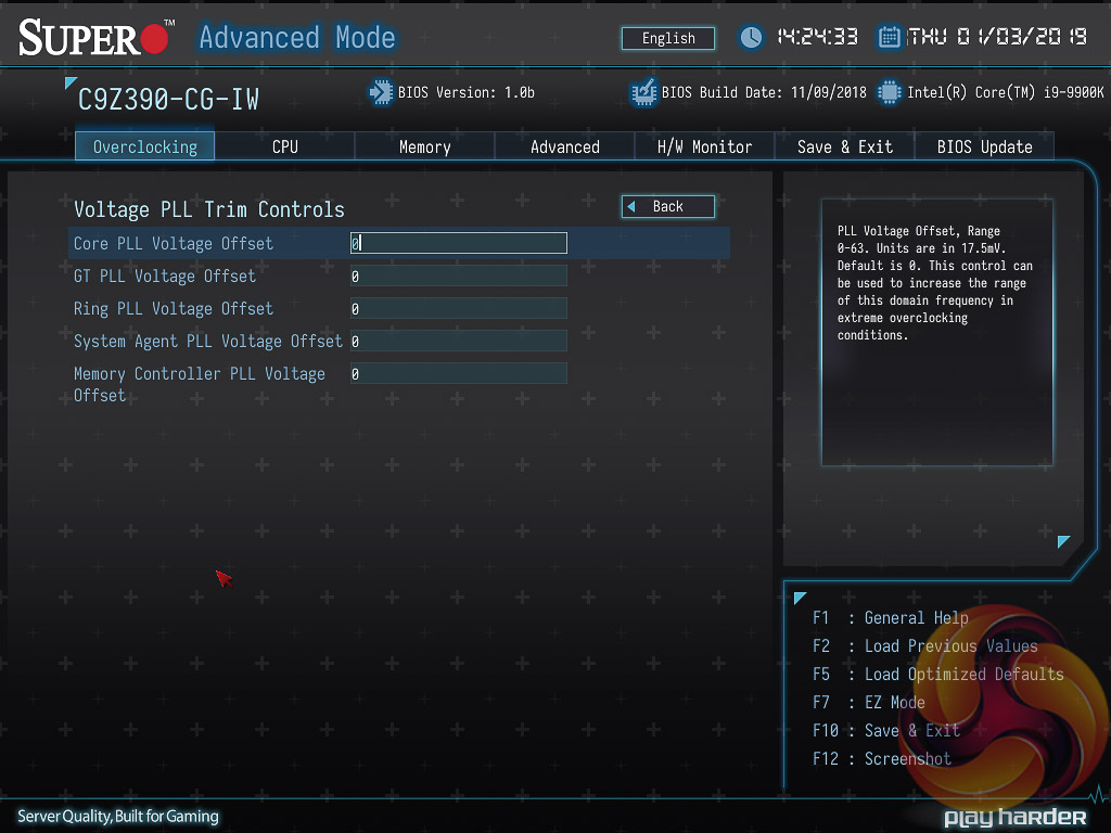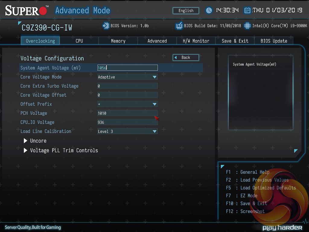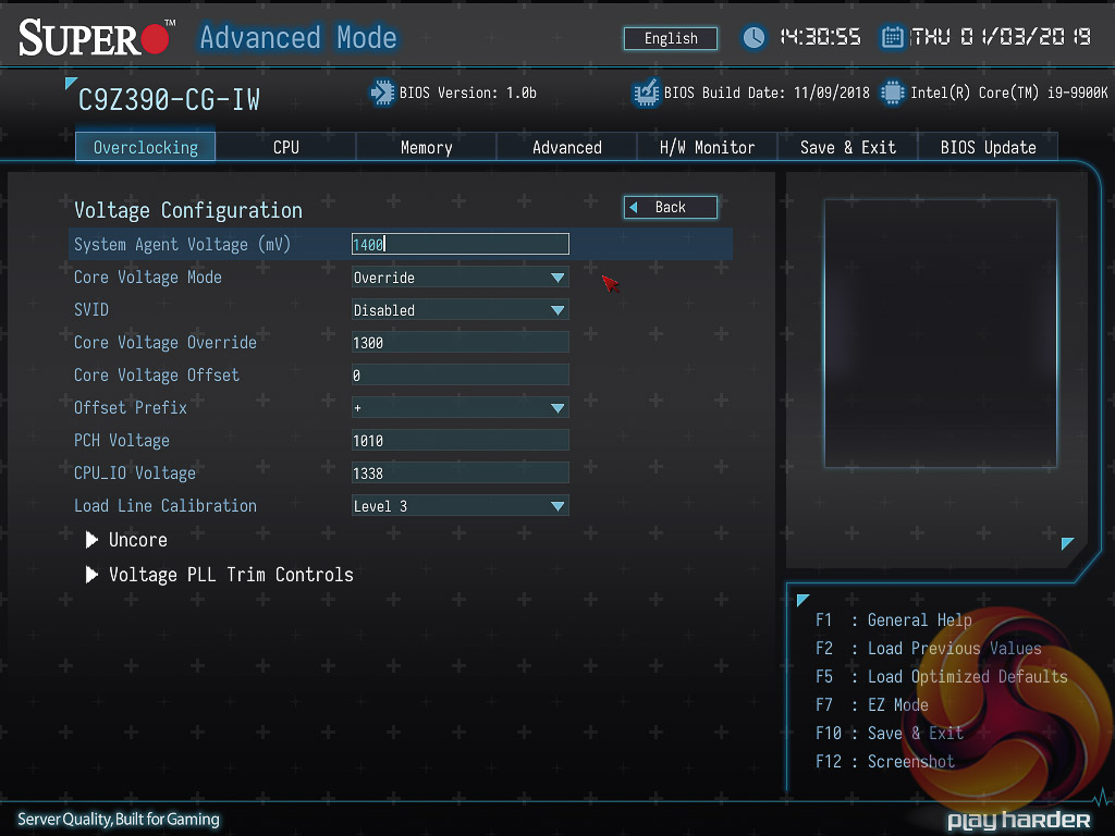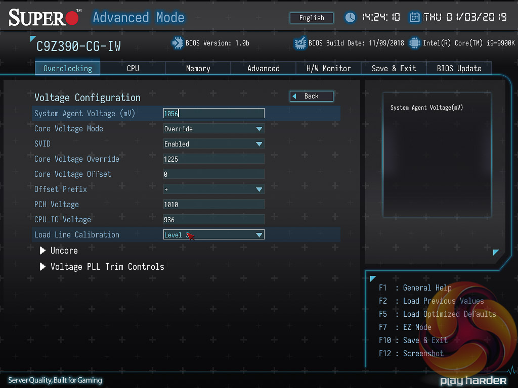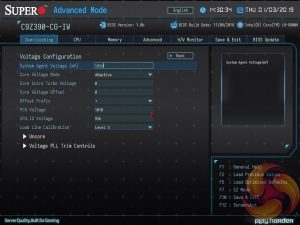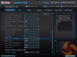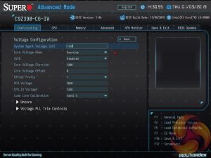 The Overclocking options are exhaustive and Supermicro appears to give the user just about every option that Intel’s hardware allows for. It can be a little intimidating at first but there’s no reason to treat overclocking any different to other motherboards – simply dial in a core voltage in the “Voltage Configuration” section, using the millivolt format (1.2v = 1200mv), and then set the core ratio in the main “CPU Overclocking” section by tweaking all the core ratios to the desired frequency.