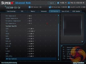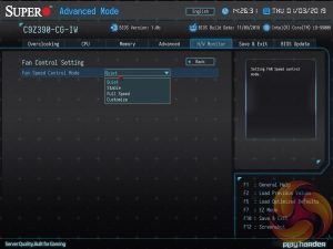 The H/W Monitor section holds the system monitoring data and fan controls. In the fan control section the setting needs to be set to “Customize” to allow the user to change the fan behaviour for each fan, each fan must be programmed manually and there are no default profiles. The “fan curves” have four temperature thresholds with four corresponding fan speeds, it is not possible to create smoother fan profiles than this or use any custom fan hysteresis settings (the time delay between speed changes).