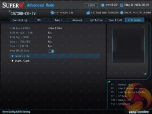 The BIOS Update window displays the current BIOS version and once “Start Update” is selected the system reboots back into the UEFI with new options available – select file and start flash. There is no internet update option from within the UEFI environment.