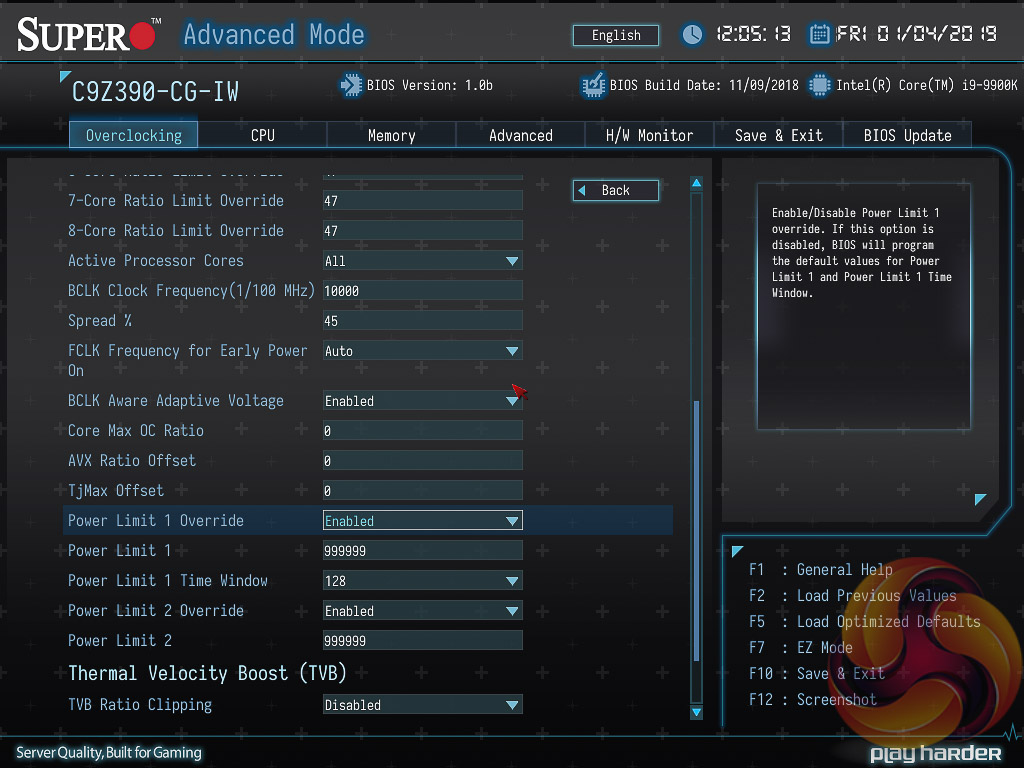 Therefore when overclocking, you can simply set both power limits to sufficiently high numbers that the CPU Turbos without (feasible) power restrictions forever. As above we set the power limit to 999.999W, the largest value accepted (Supermicro's UEFI works in thousands so 95W = 95000, 999.999W = 999999), and then set our multiplier and core voltage accordingly.