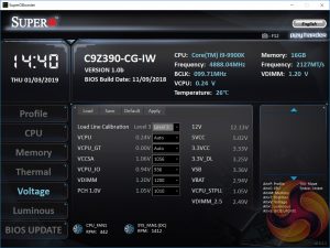 The voltage section is as it sounds, and allows for on-the-fly adjustments to the various key voltages used by the system. If the software displays blank values upon start-up, which it did for us on a couple of occasions, then it needs to be restarted.