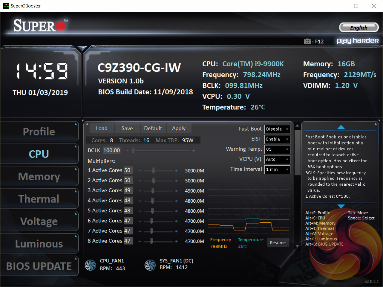 Supermicro’s SuperO Booster software is the main software package for the Supermicro C9Z390-CG-IW. It is a somewhat similar idea to the likes of ASUS AI Suite, ASRock A-Tuning/F-Stream, Gigabyte EasyTune and MSI Command Center, except better unified. Supermicro earns credit for convenience since all its relevant and useful functionality sits inside this single software package.