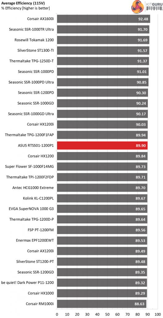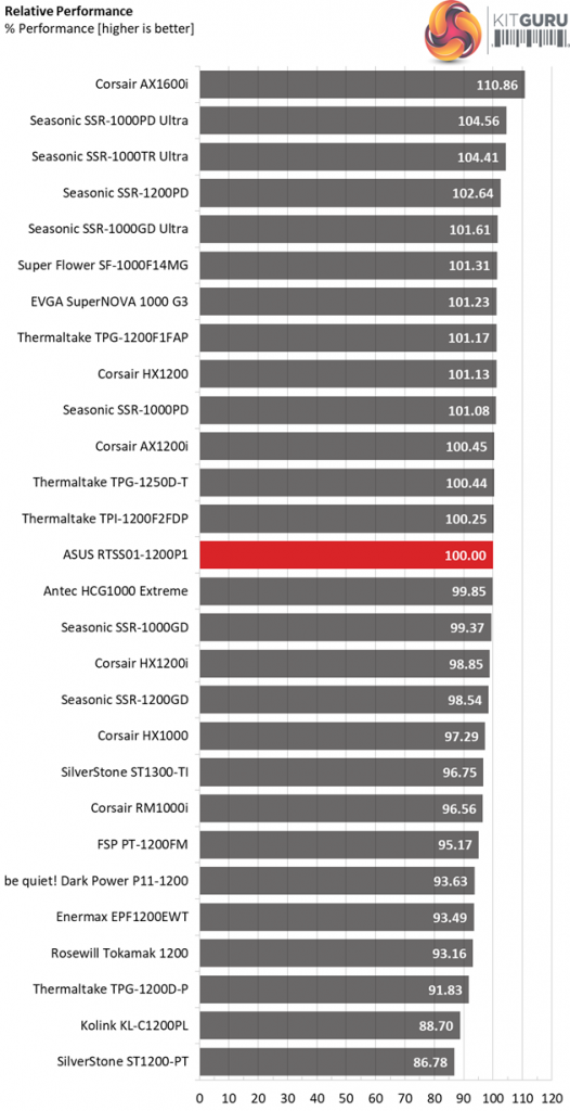The following graph shows the RTSS01-1200P1’s total performance rating, comparing it to other units we have tested. To be more specific, the tested unit is shown as 100 percent, and every other unit's performance is shown relative to it.