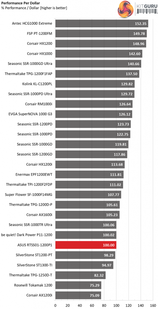 The following chart may be the most interesting to many of you because it depicts the product’s performance-per-dollar score. We looked up the current price of each PSU on popular online shops and used those prices and all relative performance numbers to calculate the index. Note that all of the numbers in the following graphs are normalized by the rated power of each unit.