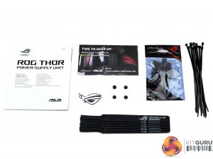 Besides the user's manual the bundle includes zip ties, several Velcro straps, a ROG sticker, a set of fixing bolts and a number of cable combs which will help you arrange better the individually sleeved cables.