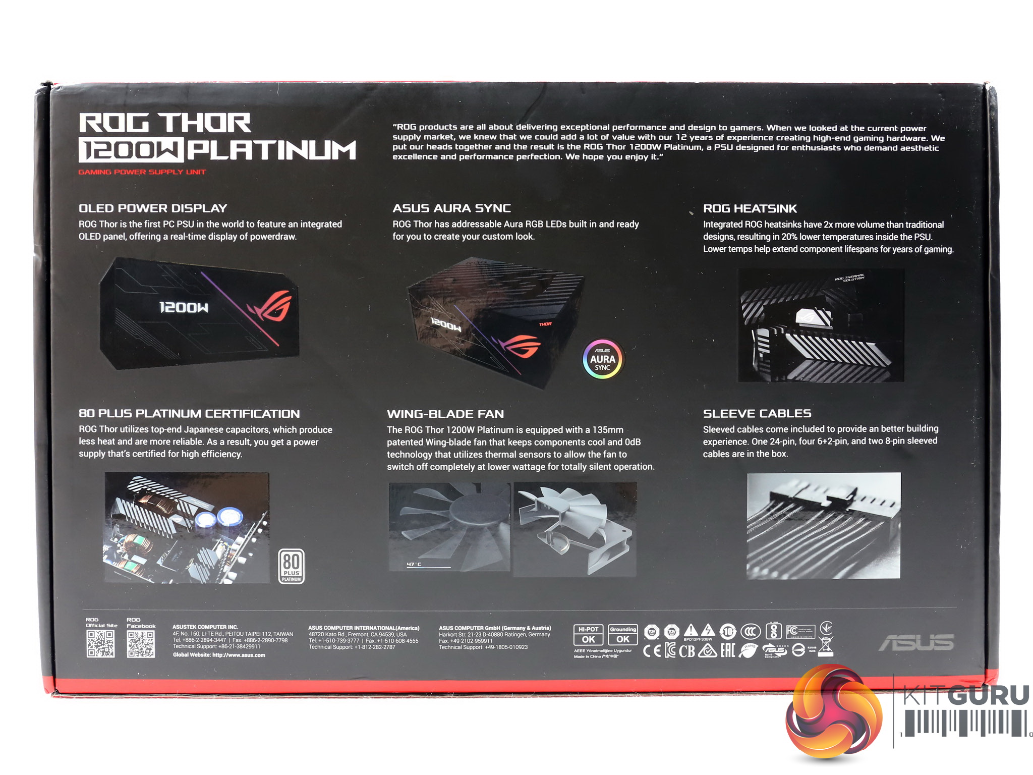 The model description is also provided on the sides of the box, while in the back side Asus mentions the most important features including the OLED display, the RGB lighting, the individually sleeved cables and the large heatsinks used at this unit's internals.